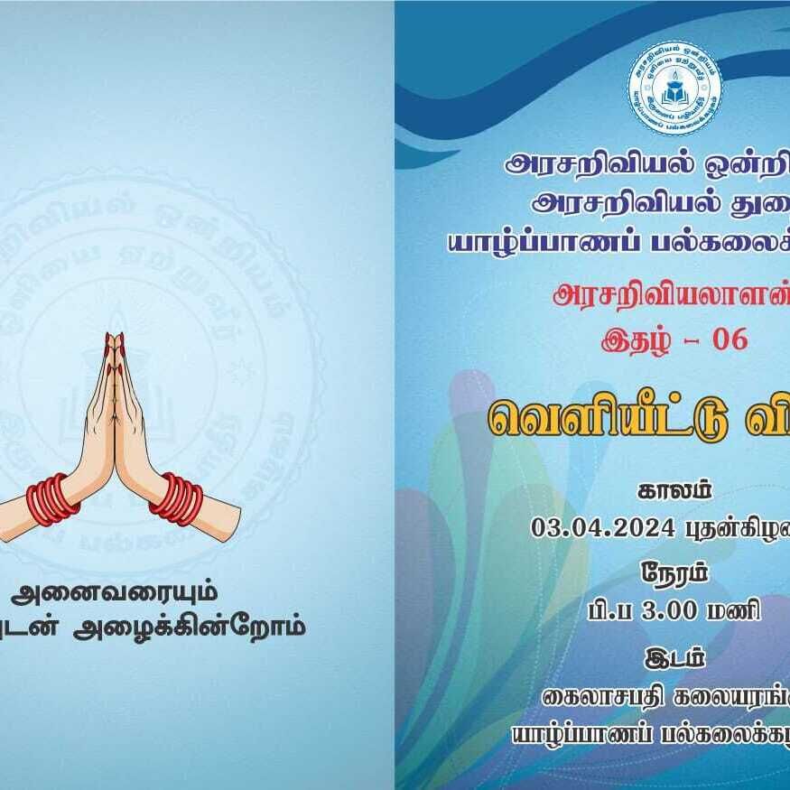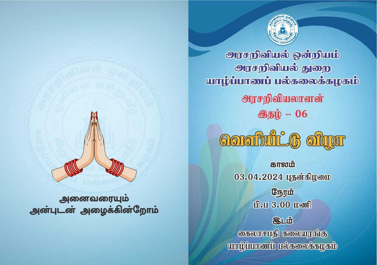 யாழ்ப்பாணப் பல்கலைக்கழகத்தின் அரசறிவியல் ஒன்றியத்தின் இதழான “அரசறிவியலாளன்” இதழ் - 06 வது இதழ் வெளியீட்டு விழா இன்று (03) புதன்கிழமை பிற்பகல் (03.04.2024) 3.00 மணியளவில்
