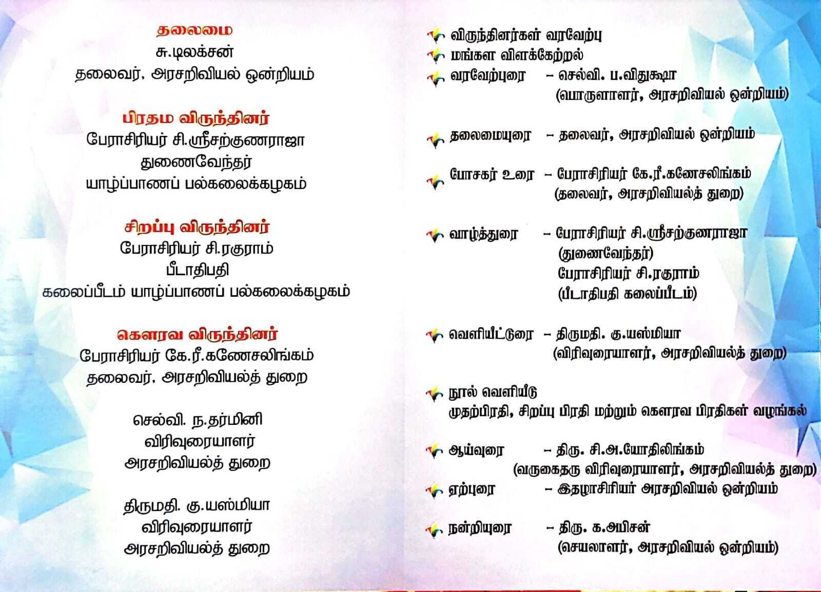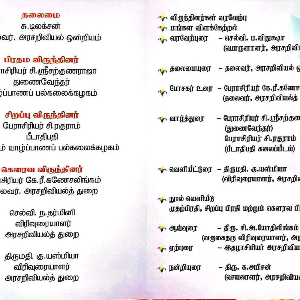 இதில் பிரதம விருந்தினராக யாழ்ப்பாணம் பல்கலைக்கழக துணை வேந்தர் பேராசிரியர் சி. சிறி சற்குணராசா அவர்களும், சிறப்பு விருந்தினராக கலைப்பீட பீடாதிபதி சி. ரகுராம் அவர்களும், கௌரவ விருந்தினர்களாக அரசறியியல் துரை தலைவர் பேராசிரியர் கே.ரீ. கணேசலிங்கம், அரசறிவியல் துறை விரிவுரையாளர்களான ந. தர்மினி, கு. யஸ்மிகா ஆகியோர் கலந்து சிறப்பிக்கவுள்ளனர்.