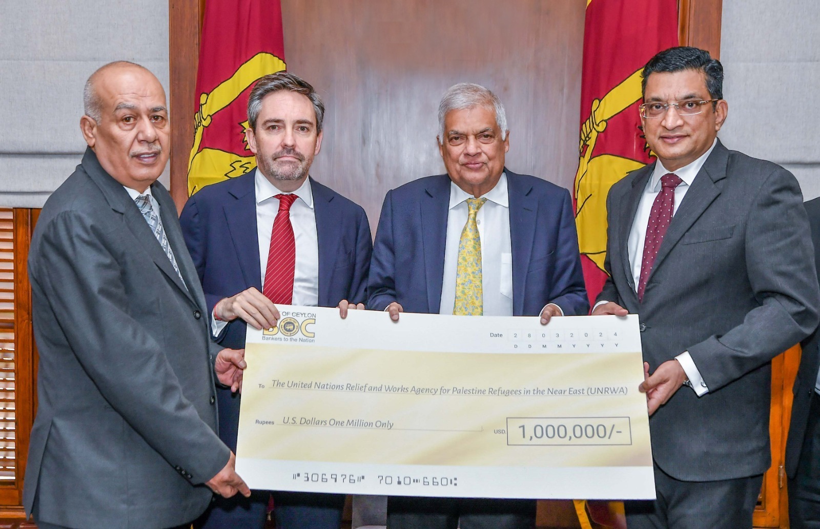இதற்கான காசோலை ஜனாதிபதி ரணில் விக்ரமசிங்கவினால் இலங்கைக்கான பலஸ்தீன தூதுவர் கலாநிதி சுஹேர் ஹம்தல்லாஹ் ஸைதிடம் (Dr. Zuhair Hamdallah Zaid) உத்தியோகபூர்வமாக கையளிக்கப்பட்டது.