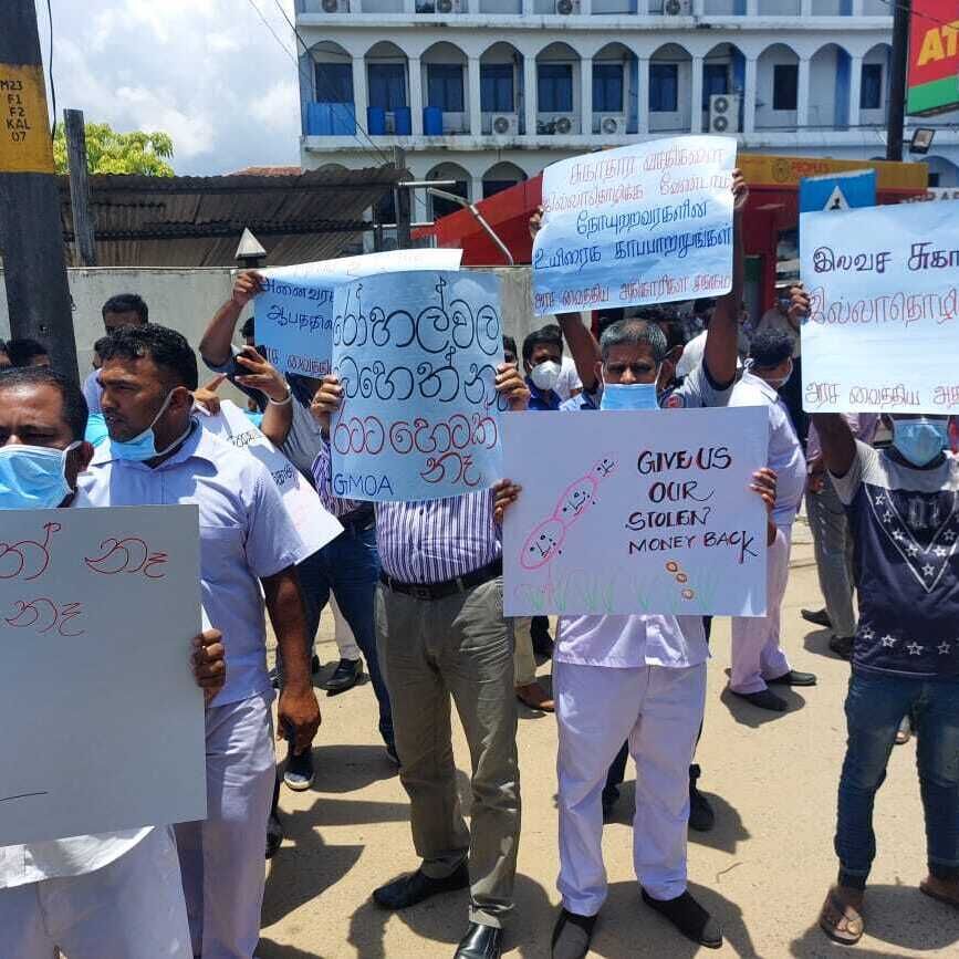 பகல் உணவு நேர தொழிற்சங்க போராட்டம் என்ற ரீதியில் வைத்தியசாலை முன்றலில் ஒழுங்கு செய்யப்பட்டிருந்த ஆர்ப்பாட்டத்தில் வைத்தியர்கள், தாதியர்கள், உத்தியோகத்தர்கள் மற்றும் ஊழியர்களும் பங்கேற்றிருந்தனர்.