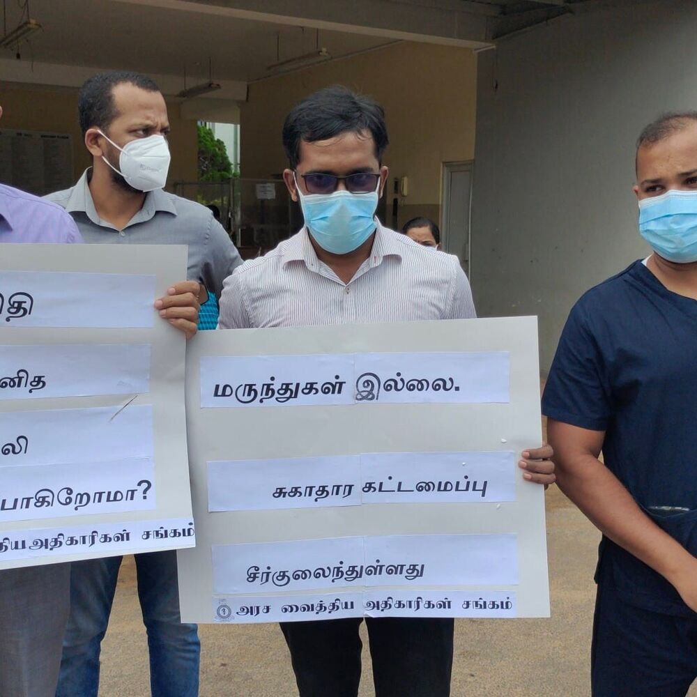 இதன்போது அரசாங்கத்தின் செயற்பாட்டினால் ஏற்பட்டுள்ள மருந்துத் தட்டுப்பாடு மற்றும், சுகாதாரப் பொருட்களின் தட்டுப்பாடுகளால் சுகாதாரத் துறையை முழுமையாக முன்னெடுக்க முடிவில்லை என்பது தொடர்பான பதாதைகளை ஏந்தியிருந்ததுடன், கோசங்களையும் எழுப்பினர்.
