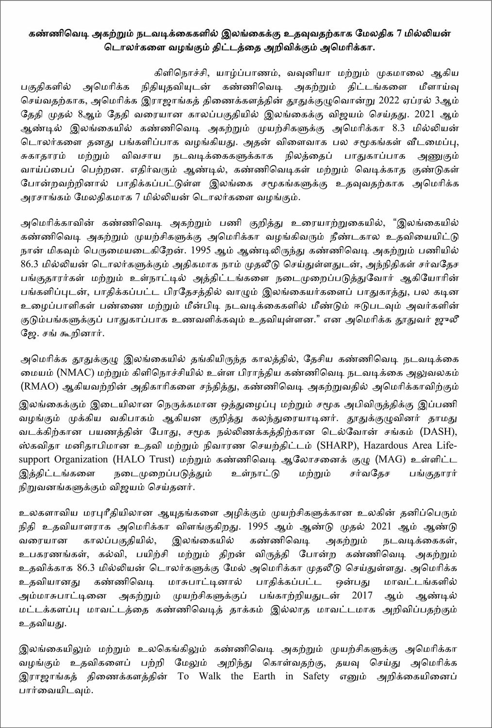 A delegation from the U.S. Department of State visited Sri Lanka from April 3-8, 2022, to review U.S.-funded demining projects in Kilinochchi, Jaffna, Vavuniya, and Muhamalai. The United States contributed $8.3 million to demining efforts in Sri Lanka in 2021, resulting in many communities gaining safe access to land for housing, sanitation, and agricultural activities. Over the coming year, the U.S. government will provide an additional $7 million to assist Sri Lankan communities affected by landmines and unexploded ordnance.