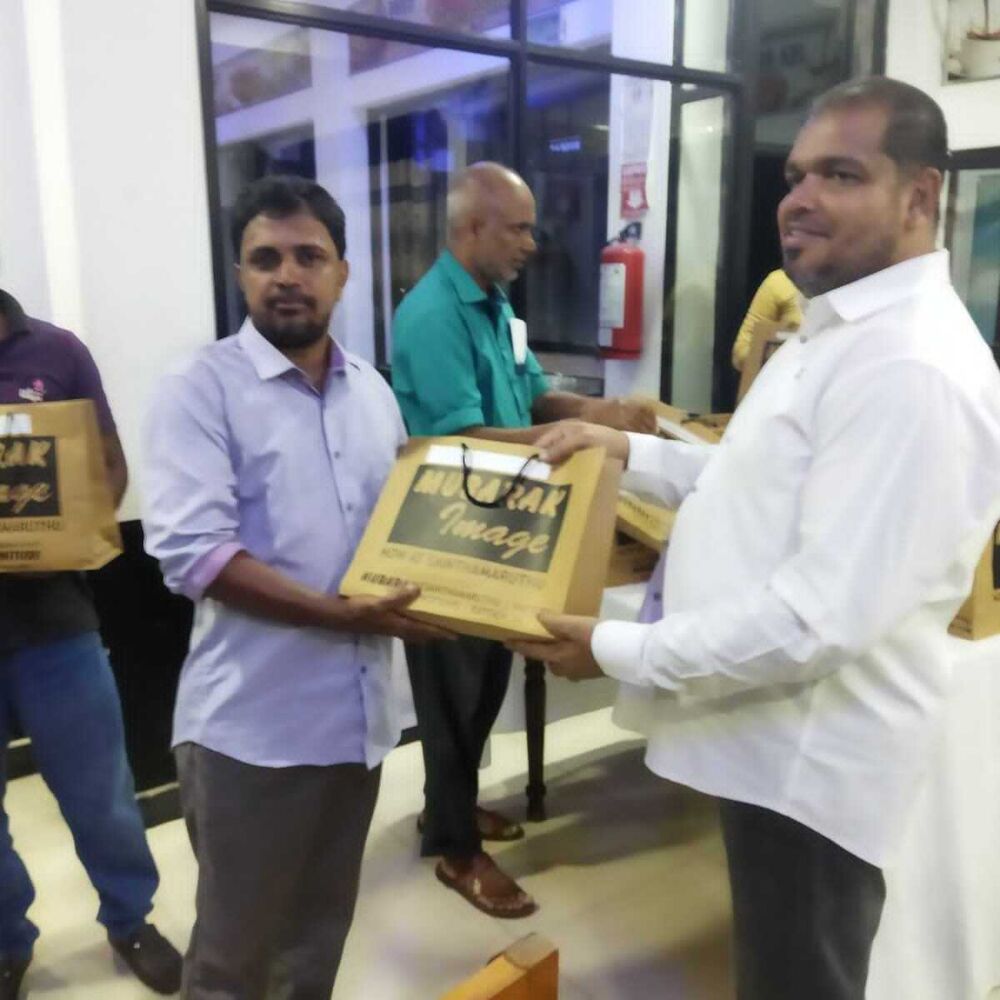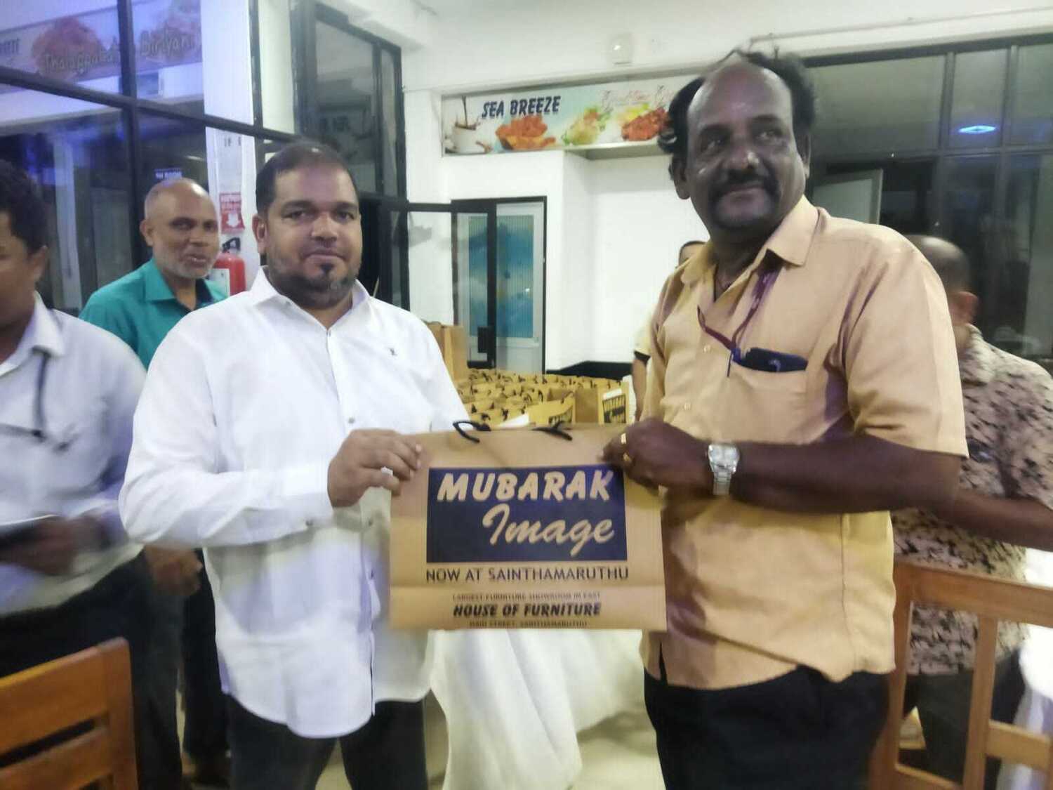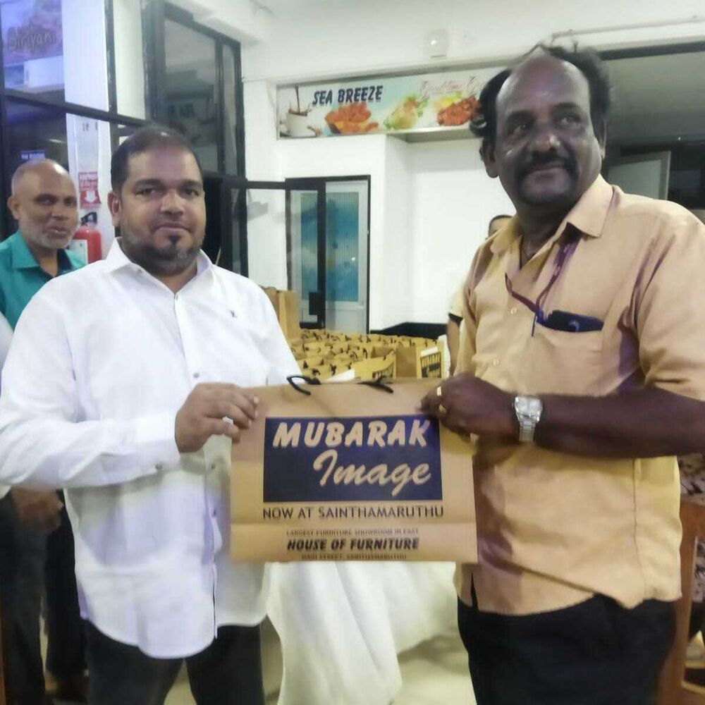 மறைந்த ஒலிபரப்பாளர் மர்ஹ{ம் ஏ.ஆர்.எம். ஜிப்ரி மற்றும் பிறை எப்.எம் பணிப்பாளர் பஷீர் அப்துல் கையூம் ஆகியோருக்கு நோன்ப பெருநாளுக்காக இரு காசோலைகளை வழங்கியதுடன், நிகழ்வில் கலந்து கொண்ட சகல தமிழ், முஸ்லிம் ஊடகலியலாளர்களுக்கும் தமது முபாறக் இமேஜ் (ஆண்களுக்கான ஆடையகம்) சார்பில் புத்தாடைகள் கொண்ட பெருநாள் பொதிகளையும் வழங்கினார்.