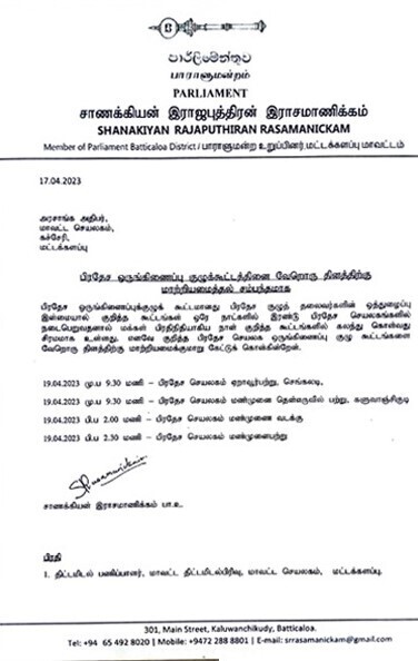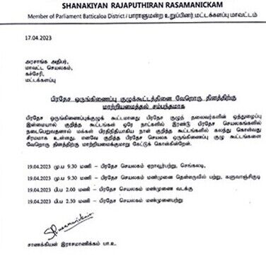 இது தொடர்பில் இரா. சாணக்கியன், இன்றைய தினம் மாவட்ட அரசாங்க அதிபருக்கு கடிதம் ஒன்றினை அனுப்பி வைத்துள்ளதுடன் அக் கூட்டங்களை வேறு தினத்திற்கு மாற்றியமைக்குமாறும் கோரிக்கை விடுத்துள்ளார்.