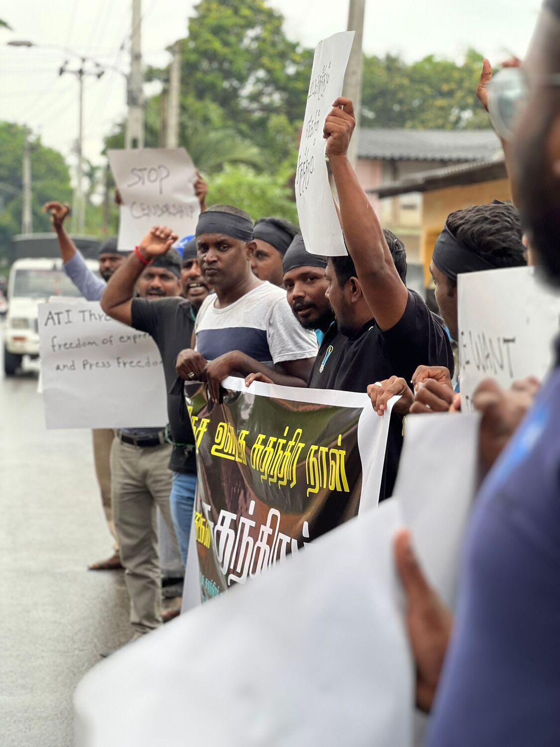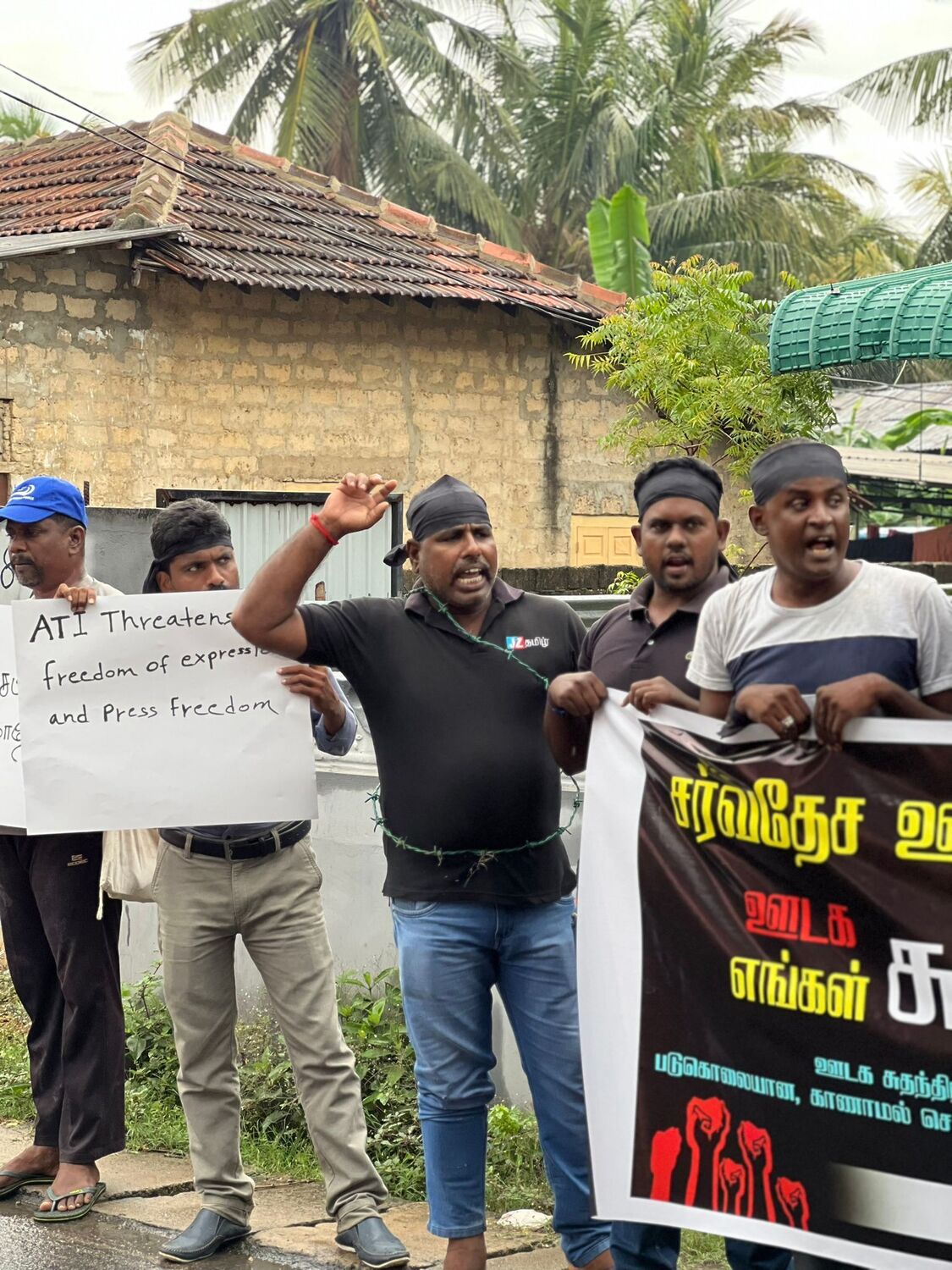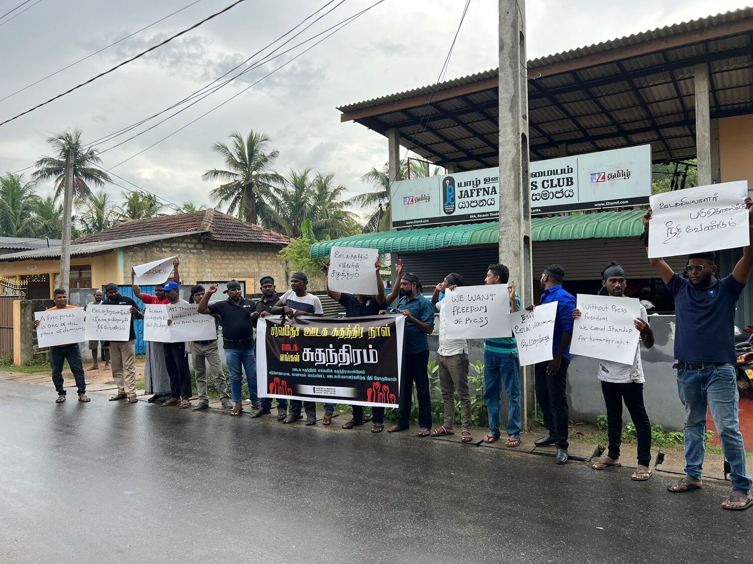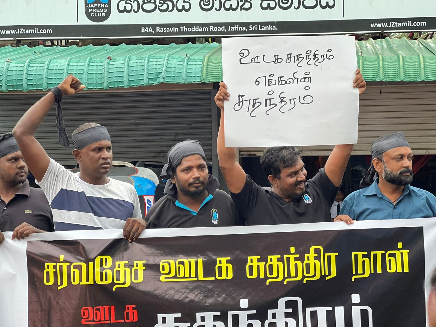 அதன் போது, ஊடக சுதந்திரத்தை வலியுறுத்தியும், படுகொலை செய்யப்பட்ட ஊடகவியலாளர்களுக்கு நீதி கோரியும், கொண்டுவரப்படவுள்ள பயங்கரவாத எதிர்ப்பு சட்டத்திற்கு எதிர்ப்பு தெரிவித்தும் ஊடகவியலாளர்களால் கோஷங்கள் எழுப்பட்டன.