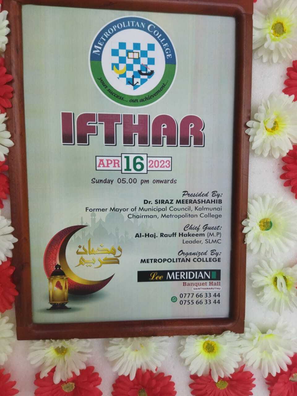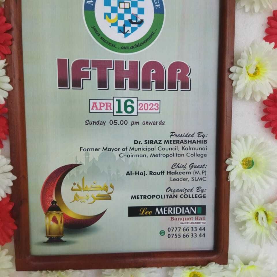 நாட்டில் பல்வேறு கிளைகளை கொண்டு இயங்கும் பிரபல தனியார் உயர் கல்வி நிறுவனமான மெற்ரோபொலிட்டன் கல்லூரியின் வருடாந்த இன நல்லுறவுக்கான இப்தார் நிகழ்வு கல்லூரி முதல்வரும், ஸ்தாபக தவிசாளரும் கல்முனை மாநகர சபை முன்னாள் மேயருமான ஸ்ரீலங்கா முஸ்லிம் காங்கிரஸ் உயர்பீட உறுப்பினர் கலாநிதி சிராஸ் மீராசாஹிப் தலைமையில் சாய்ந்தமருது லீ மெரிடியன் வரவேற்பு மண்டபத்தில் இன்று (16) இடம்பெற்றது.