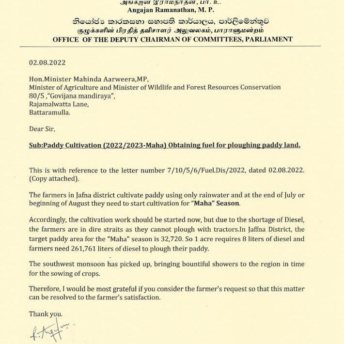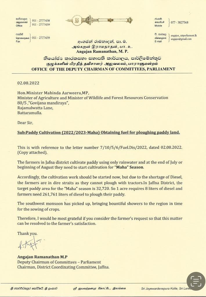 யாழ் மாவட்ட விவசாயிகள் பெரும்போக நெற்செய்கையை சிறந்த முறையில் மேற்கொள்ள தேவையான எரிபொருளினை இரு வார காலத்திற்குள் தந்துதவுமாறு யாழ் மாவட்ட பாராளுமன்ற உறுப்பினர் அங்கஜன் இராமநாதன் எரிசக்தி அமைச்சர் காஞ்சன விஜயசேகர மற்றும் கமத்தொழில் அமைச்சர் மஹிந்த அமரவீர ஆகியோரிடம் எழுத்து மூலம் கோரிக்கை விடுத்துள்ளார்.