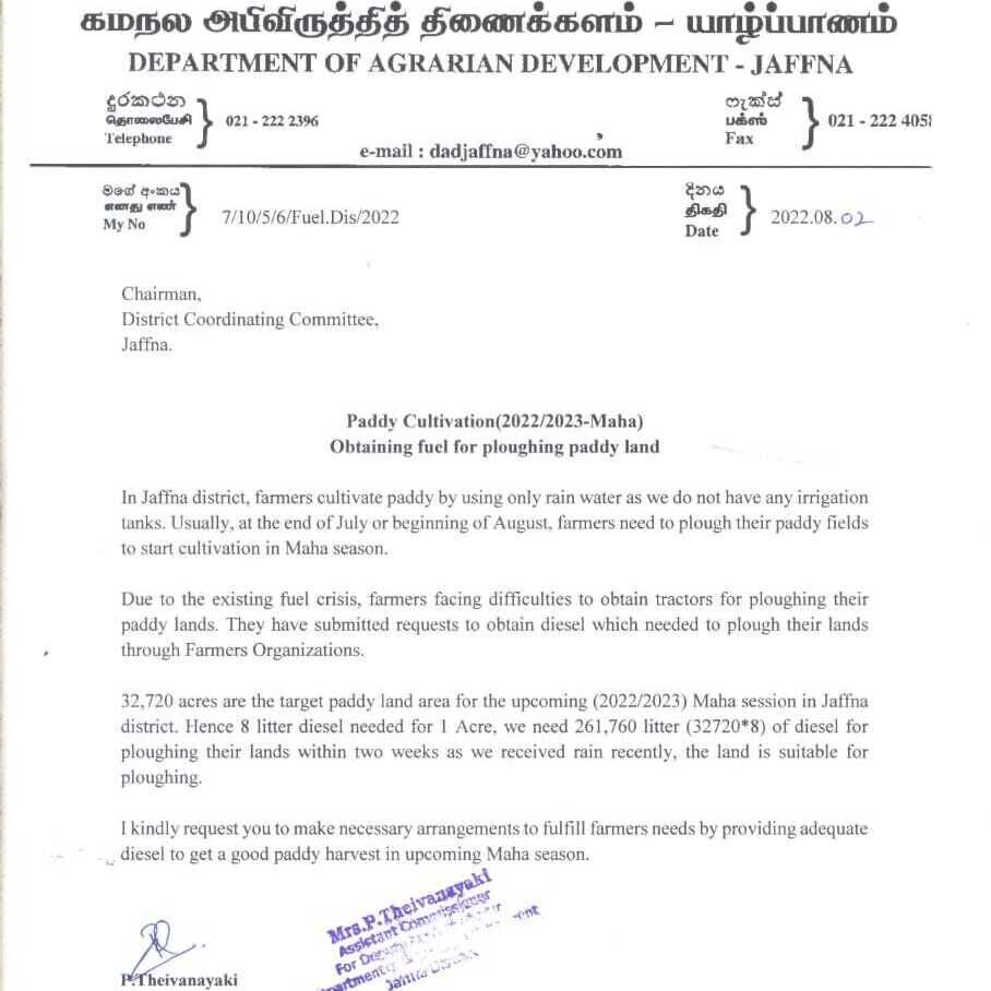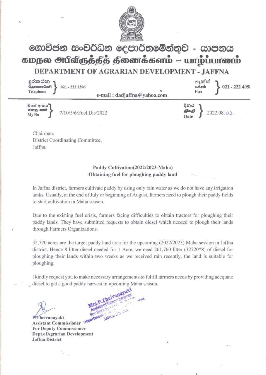 யாழ் மாவட்டத்தில் தற்போது உழவு மழை பெய்ய ஆரம்பித்துள்ளது. எனவே இரு வார காலத்திற்குள் டீசல் கிடைக்கப்பெறும் பட்சத்தில் சிறந்த முறையில் நெற்பயிர்ச்செய்கையை முன்னெடுக்க முடியும்.