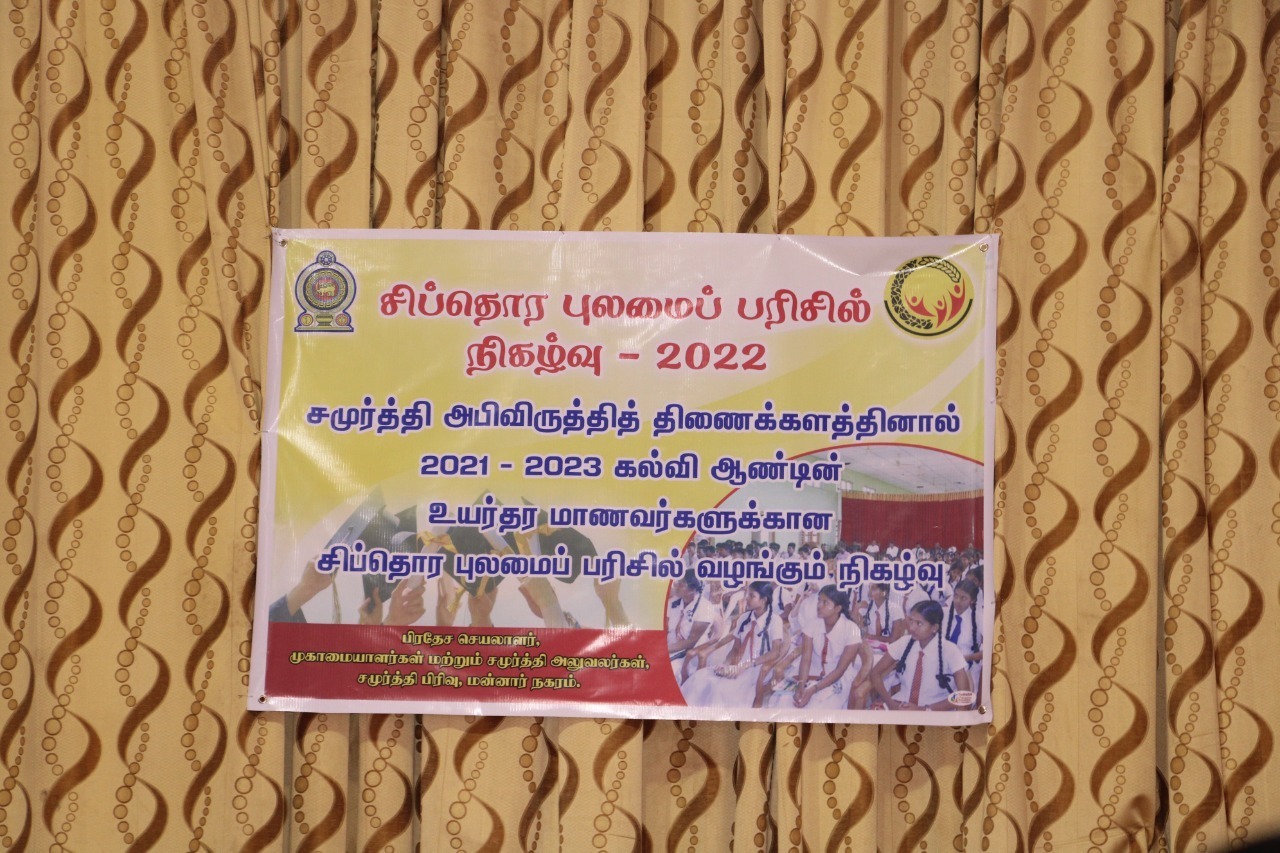 சமுர்த்தி அபிவிருத்தி திணைக்களத்தின் கீழ் உள்ள சமுர்த்தி சமூகப் பாதுகாப்பு நிதியத்தின் மூலம் மாணவர்களுக்கான சமுர்த்தி 'சிப்தொர' புலமைப்பரிசில் கொடுப்பனவு வழங்கும் நிகழ்வு மன்னார் பிரதேச செயலாளர் எம். பிரதீப் தலைமையில் வியாழக்கிழமை (01.09.2022) மன்னார் நகர மண்டபத்தில் பிற்பகல் 3 மணியளவில் நடைபெற்றது.