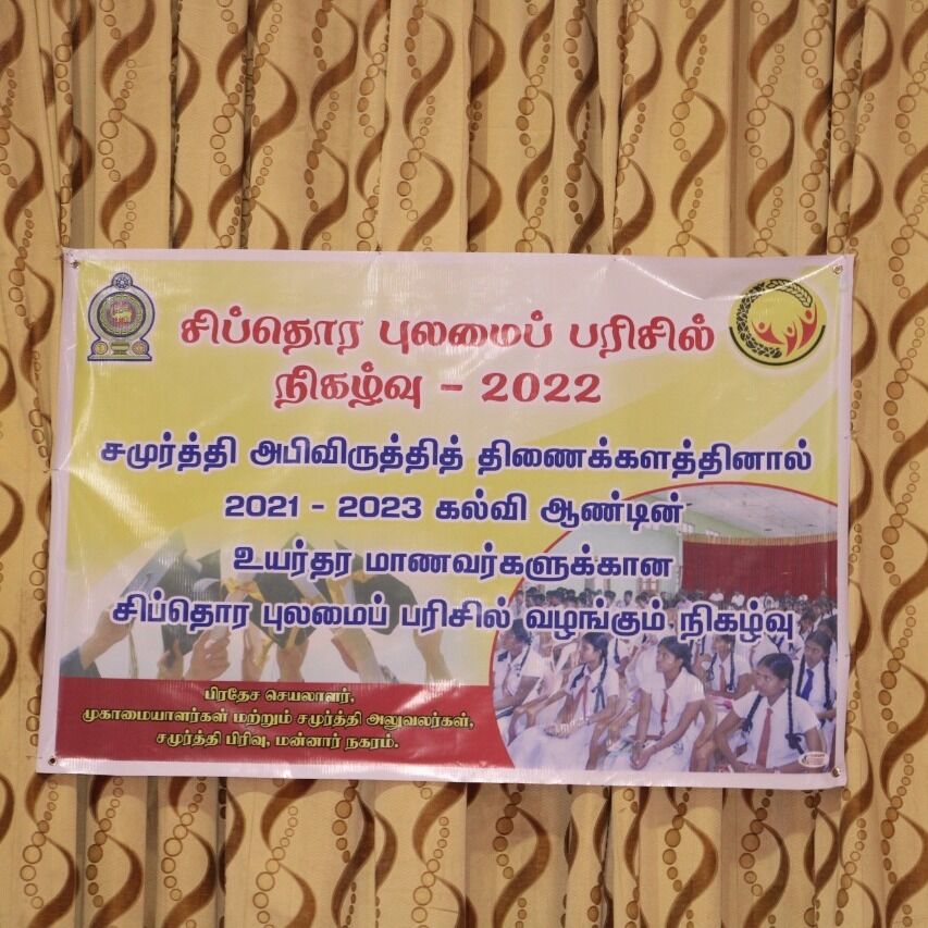 சமுர்த்தி அபிவிருத்தி வங்கி ஊடாக சமுர்த்தி உதவி பெரும் பயனாளிகளின் குடும்பங்களில் உள்ள கல்விப் பொதுத் தராதர சாதரண தரம் சித்தியடைந்து உயர்தரக் கல்வியை தொடர்கின்ற மாணவர்களின் கல்வி ஊக்குவிப்புக்காக சமுர்த்தி 'சிப்தொர' புலமைப்பரிசில் மன்னார் மாவட்டத்தில் 761 மாணவர்கள் நன்மை பெறுகின்றனர்.