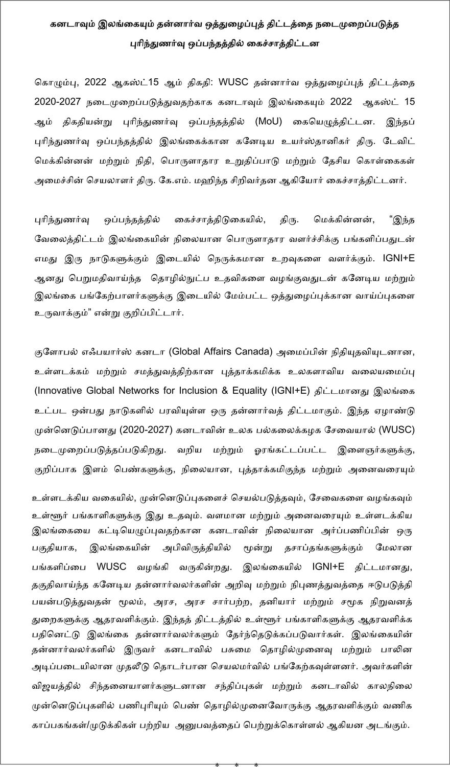 Canada and Sri Lanka signed a Memorandum of Understanding (MoU) on 15 August 2022 to implement the WUSC Volunteer Cooperation Program 2020-2027. The MoU was signed by Mr. David McKinnon, High Commissioner of Canada to Sri Lanka and Mr. K.M. Mahinda Siriwardana, Secretary, Ministry of Finance, Economic Stabilization and National Policies, at the Ministry of Finance.