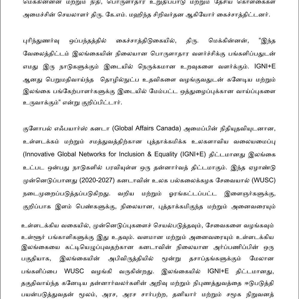 Funded by Global Affairs Canada, the Innovative Global Networks for Inclusion & amp; Equality (IGNI+E) Project is a volunteer program spanning over nine countries, including Sri Lanka. This seven year initiative (2020-2027) is implemented by the World University Service of Canada (WUSC). It will support local partners to implement initiatives and provide services for poor and marginalised youth, particularly young women, in a sustainable, innovative and inclusive manner.
