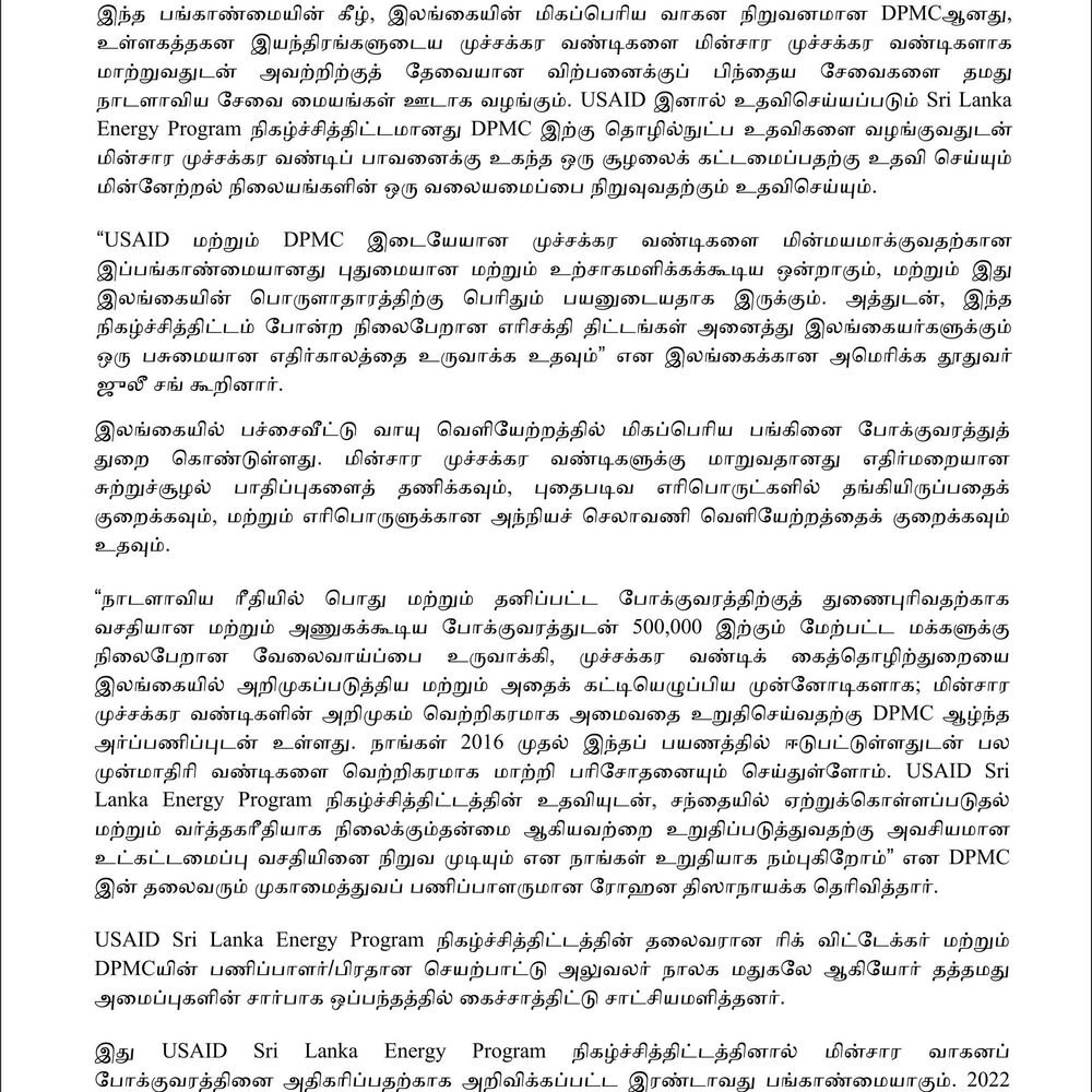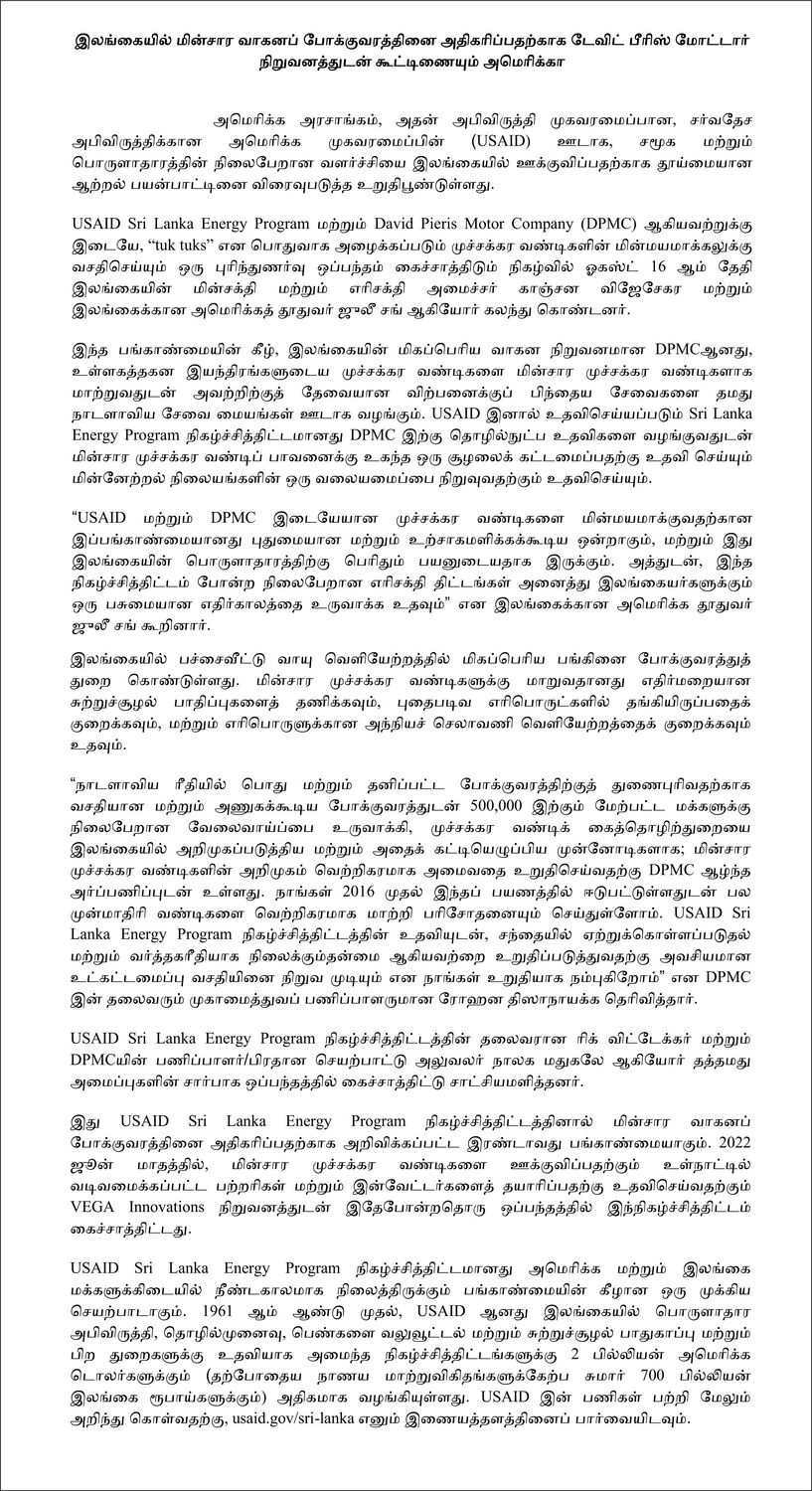 “The partnership between USAID and DPMC to electrify three-wheelers is innovative and exciting, and it stands to greatly benefit Sri Lanka’s economy. Plus, sustainable energy projects like this program help create a greener future for all Sri Lankans,” said U.S. Ambassador to Sri Lanka Julie Chung.