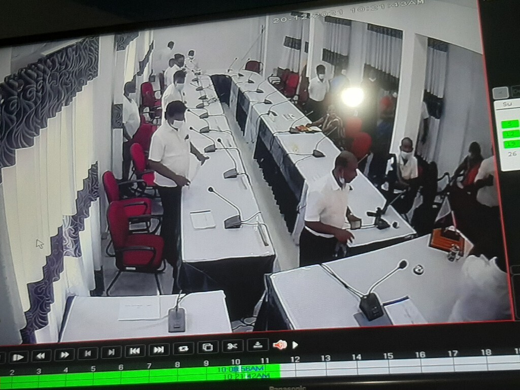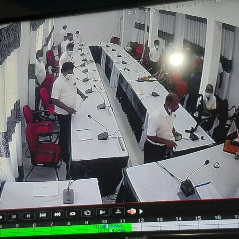இந்த நிலையிலேயே திங்கள் கிழமை (20.12.2021) இடம்பெற்ற இவ் வரவு செலவு சமர்பணம் செய்யும் இவ் விஷேட கூட்டத்தில் இதே கருத்து ஒலிக்கப்பட்டு வாத மற்றும் பிரதிவாதங்கள் இடம்பெற்றதுடன் கைகலப்பு, தவிசாளர் அமர்ந்திருக்கும் கதிரையின் மீது நீர் வீசப்பட்டு மேசையின் மீது இருந்த சிங்கக் கொடி உடைக்கப்பட்ட சம்பவங்களும் இடம்பெற்றுள்ளதாக பொலிசாரிடம் முறையீடு செய்யப்பட்டுள்ளது.