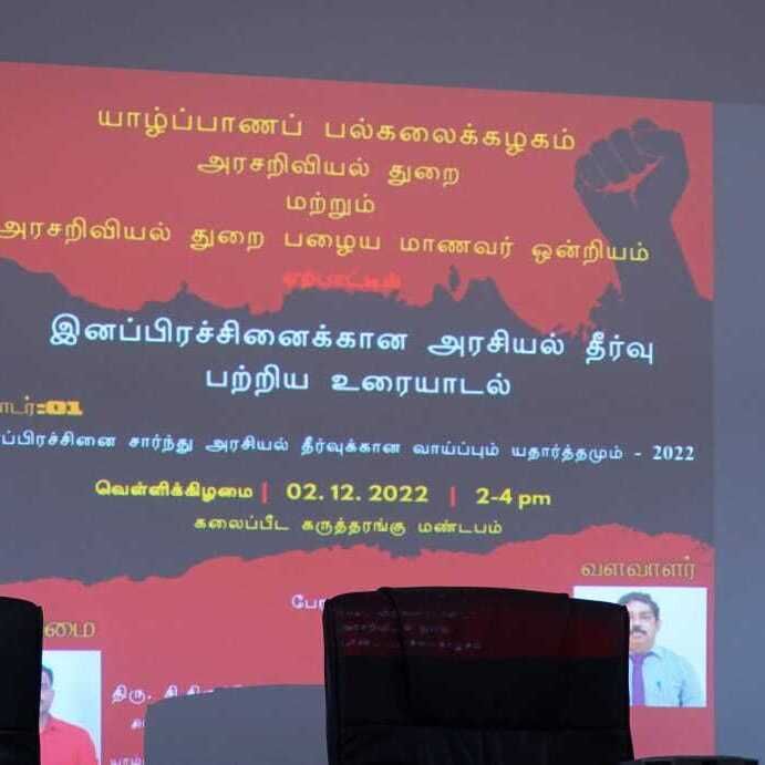 யாழ்ப்பாணப் பல்கலைக்கழகம் அரசறிவியல் துறையும், அரசறிவியல் துறை பழைய மாணவர் ஒன்றியத்தின் இணைந்து ஏற்பாடு செய்த 'இனப் பிரச்சினைக்கான அரசியல் தீர்வு பற்றிய உரையாடல்' எனும் தலைப்பிலான கருத்தரங்கு நேற்று (02) வெள்ளி பிற்பகல் 2:30 மணியளவில் யாழ் பல்கலைக்கழக கலைப்பீட கருத்தரங்கு மண்டபத்தில் சிரேஸ்ர விரிவுரையாளர் சி. திருச்செந்தூரன் தலமையில் இடம் பெற்றது.