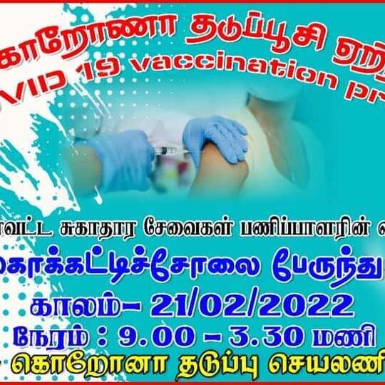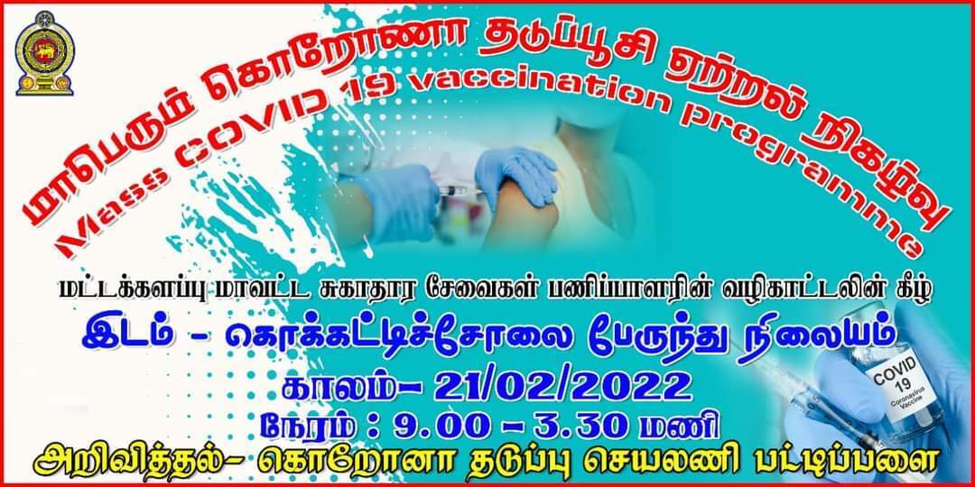 இதே வேளைபட்டிப்பளை கொவிட் தடுப்பு செயலணியின் ஏற்பாட்டிலும், பிராந்திய சுகாதார சேவைகள் பணிப்பாளரின் வழிகாட்டுதலிலும் எதிர்வரும் 21 திகதி காலை 8 மணி முதல் பிற்பகல் 3.30 மணி வரை, கொக்கட்டிச்சோலை பேருந்து நிலையத்தில் மாபெரும் கொவிட் தடுப்பூசி ஏற்றல் நிகழ்வு இடம்பெறவுமுள்ளது.