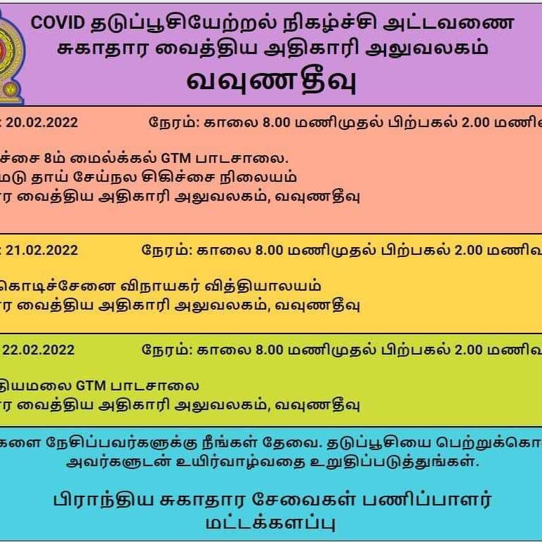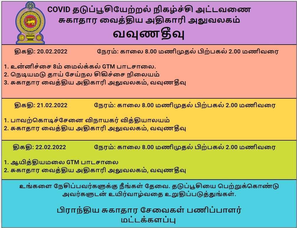 அதேபோல் 21 ஆம் திகதி பாவற்கொடிச்சேனை விநாயகர் வித்தியாலயம், வவுணதீவு சுகாதார வைத்திய அதிகாரி அலுவலகத்திலும் காலை 8 மணி முதல் பிற்பகல் 2 மணி வரையும், எதிர்வரும் 22 ஆம் திகதி ஆயித்திய மலை அரசினர் தமிழ் கலவன் பாடசாலை, வவுணதீவு சுகாதார வைத்திய அதிகாரி அலுவலகம் என்பவற்றிலும் காலை 8 மணி முதல் பிற்பகல் 2 மணி வரையும் தடுப்பூசி ஏற்றல் நிகழ்வு இடம்பெறுமெனவும் அறிவிக்கப்பட்டுள்ளது.