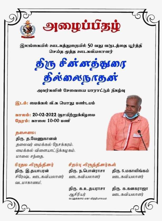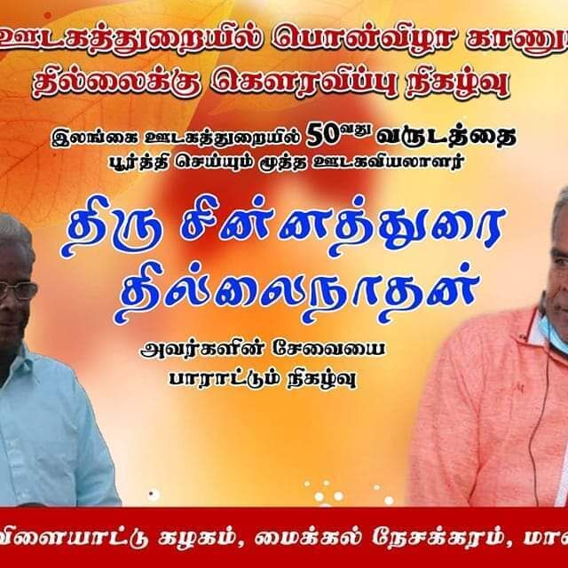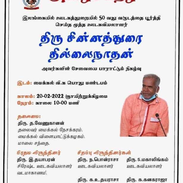 யாழ்ப்பாணம், புலோலியைச் சேர்ந்த (வயது 71) மூத்த ஊடகவிலாளர் சின்னத்துரை தில்லை நாதனின் இந்த சேவையைப் பாராட்டும் நிகழ்வு, மாலை சந்தை, மைக்கல் நேசக்கரம் மற்றும் மைக்கல் விளையாட்டுக்கழகத்தலைவர் த.வேணுகானன் தலைமையில், மைக்கல் விளையாட்டுக்கழக பொது மண்டபத்தில் நடைபெறவிருக்கின்றது.