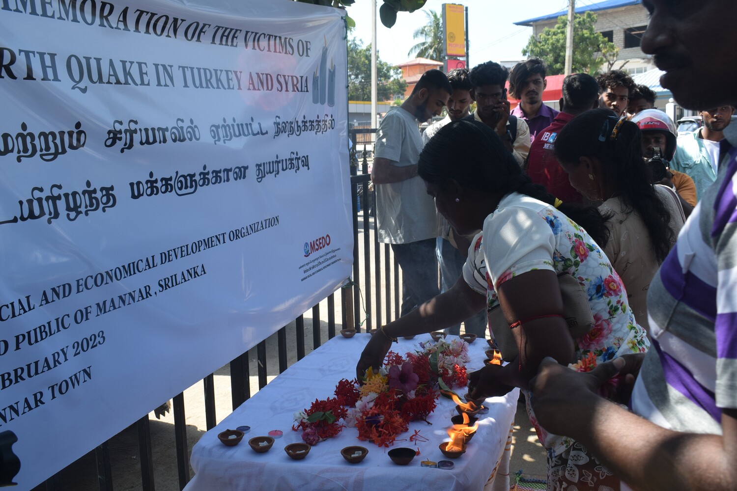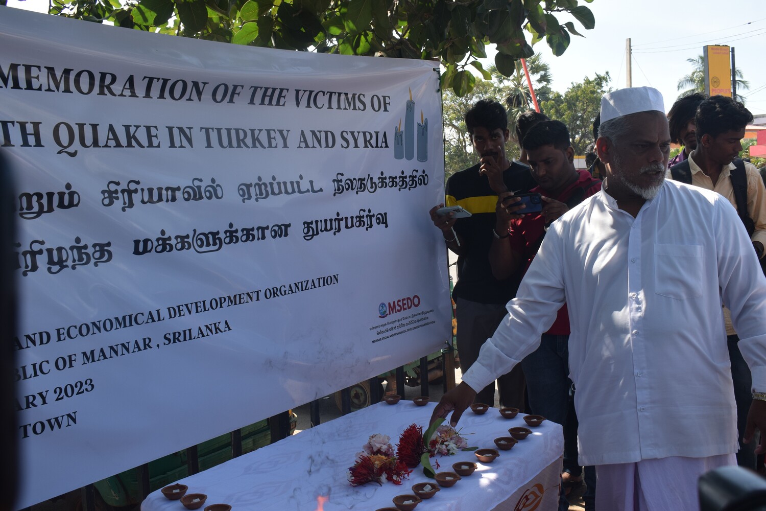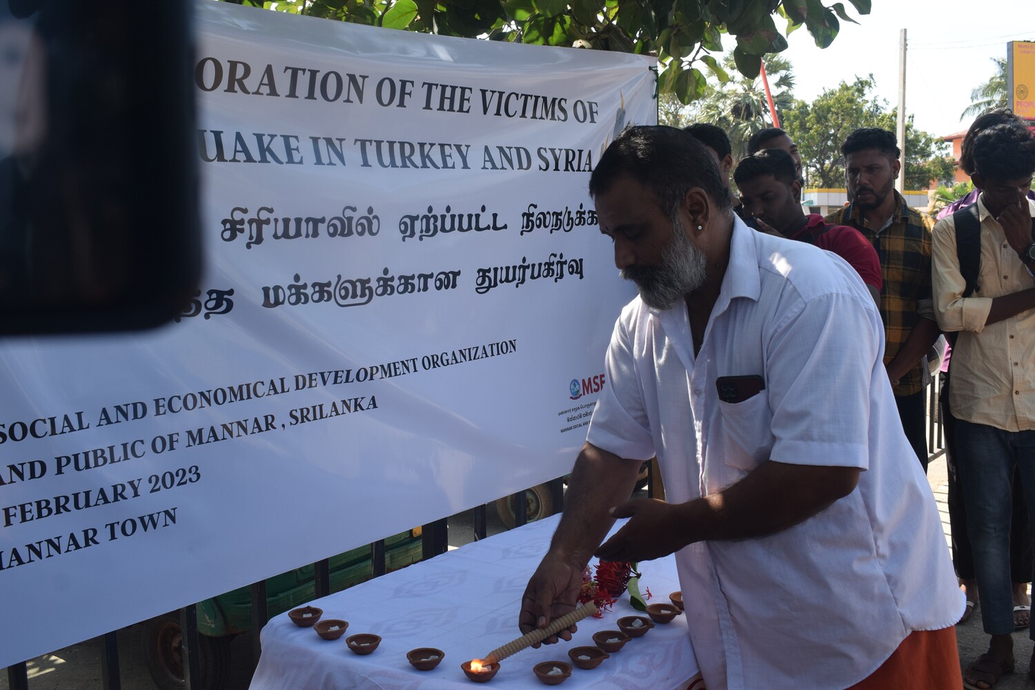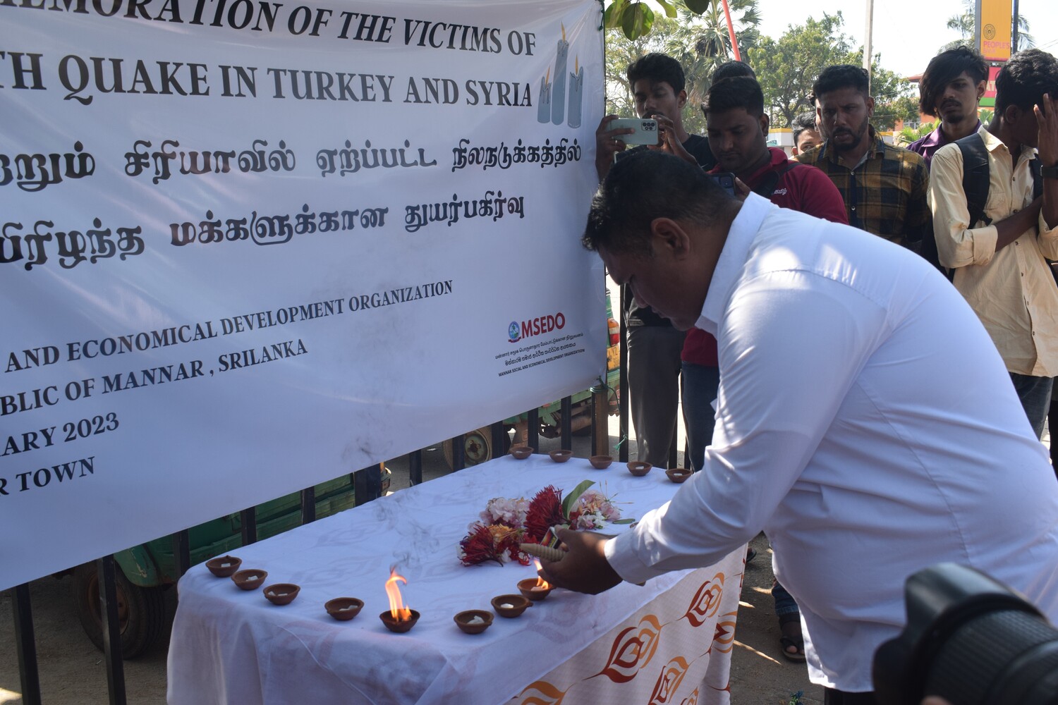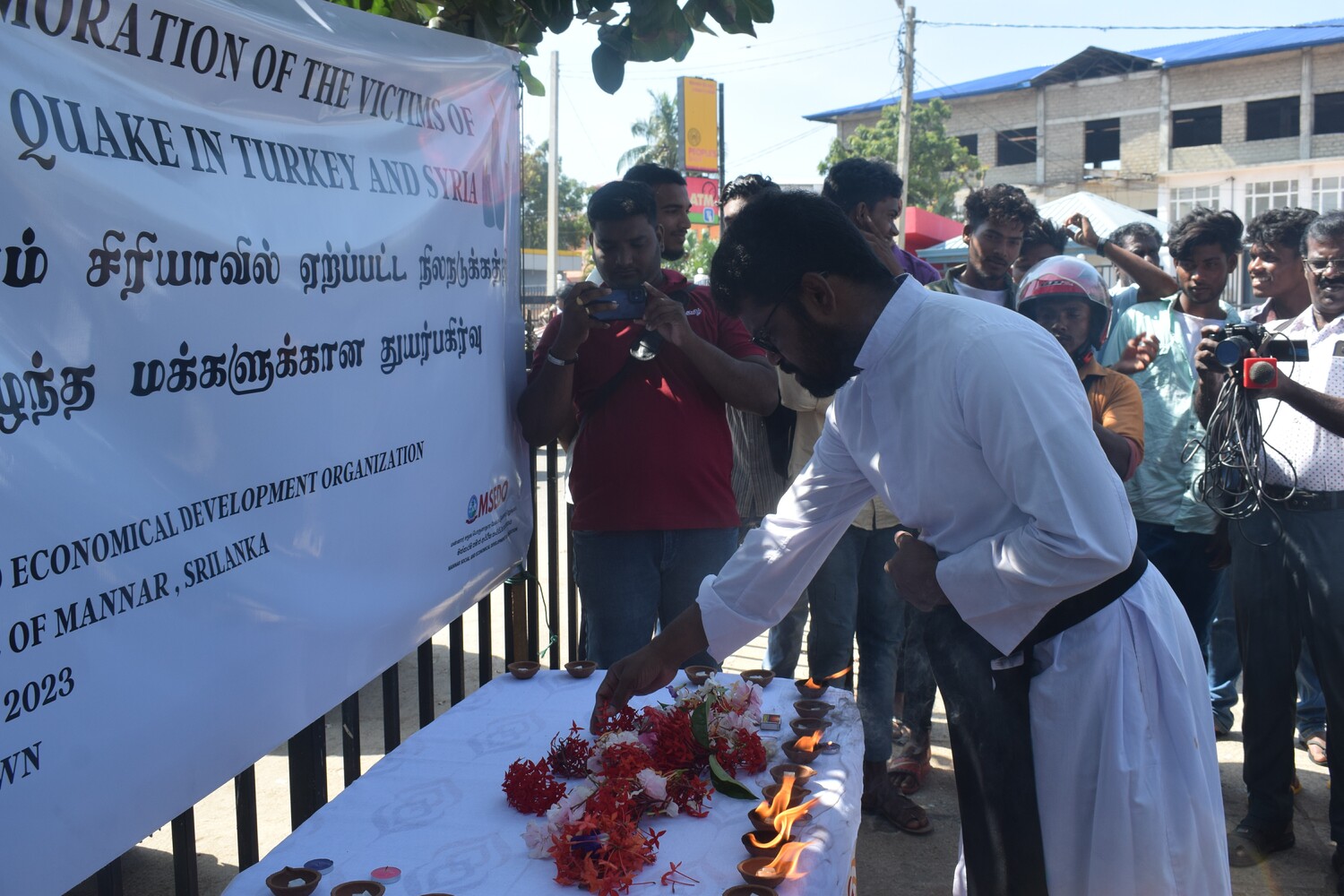 திங்கள் கிழமை (20) காலை மன்னார் நகரில் பிரதான போக்குவரத்து நிலையத்துக்கு முன்பாக துருக்கி மற்றும் சிரியாவில் அன்மையில் ஏற்பட்ட நிலநடுக்கத்தில் உயிரிழந்த மக்களுக்காக இவ்விடத்தில் சர்வமத தலைவர்கள் உட்பட பலதரப்பட்ட அமைப்புக்களின் பிரதிநிதிகள் மற்றும் பொதுநிலையினரும் ஒன்றுகூடி பிராத்தனையில் ஈடுபட்டதுடன் யாவரும் சுடர் எற்றி மலர்கள் தூவி தங்கள் அஞ்சலியை செலுத்தினர்.