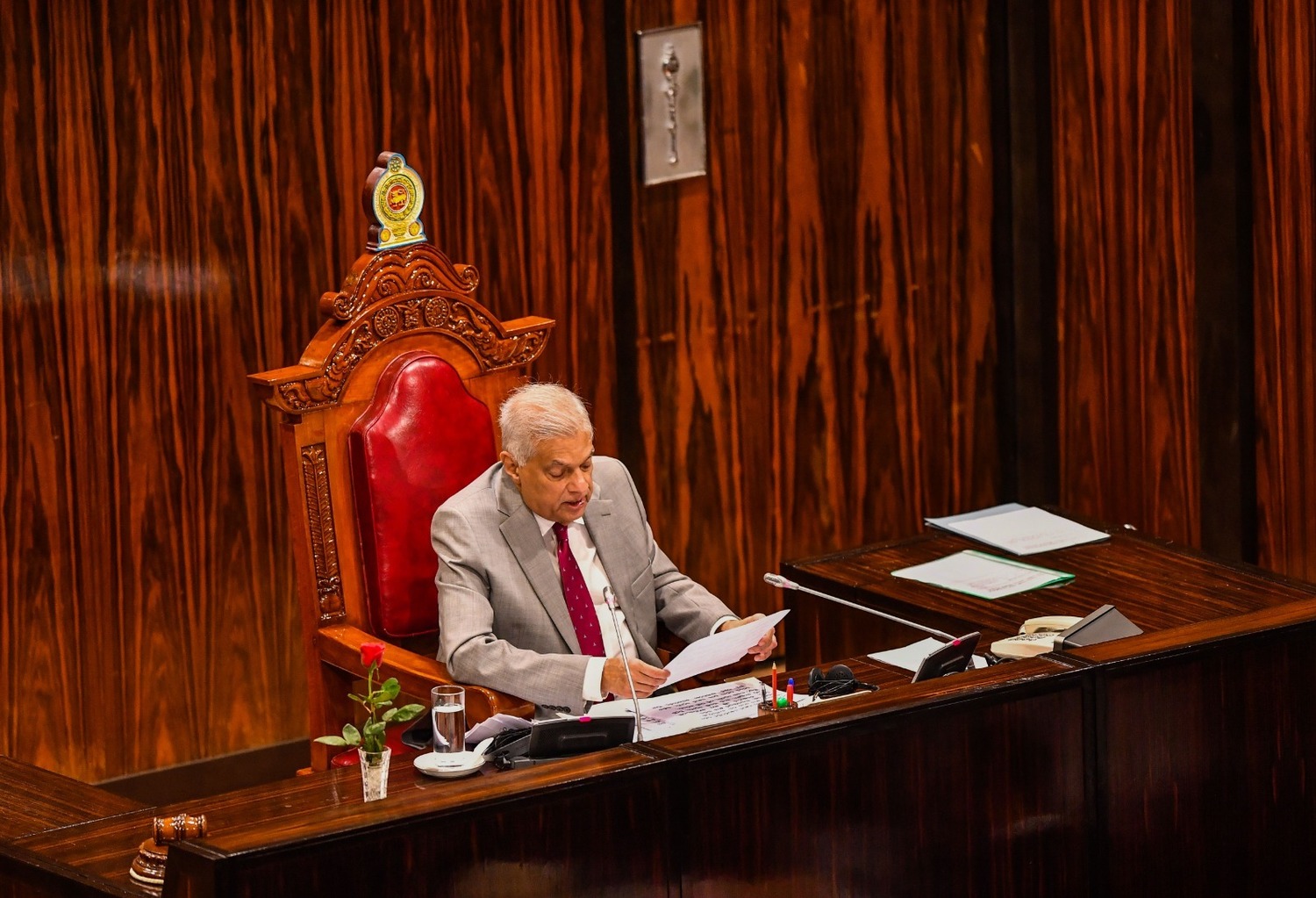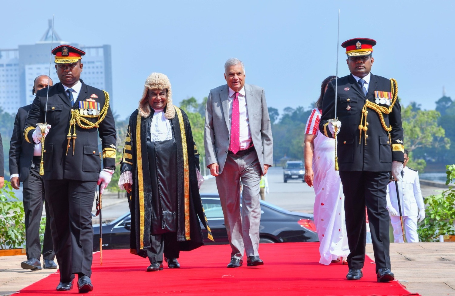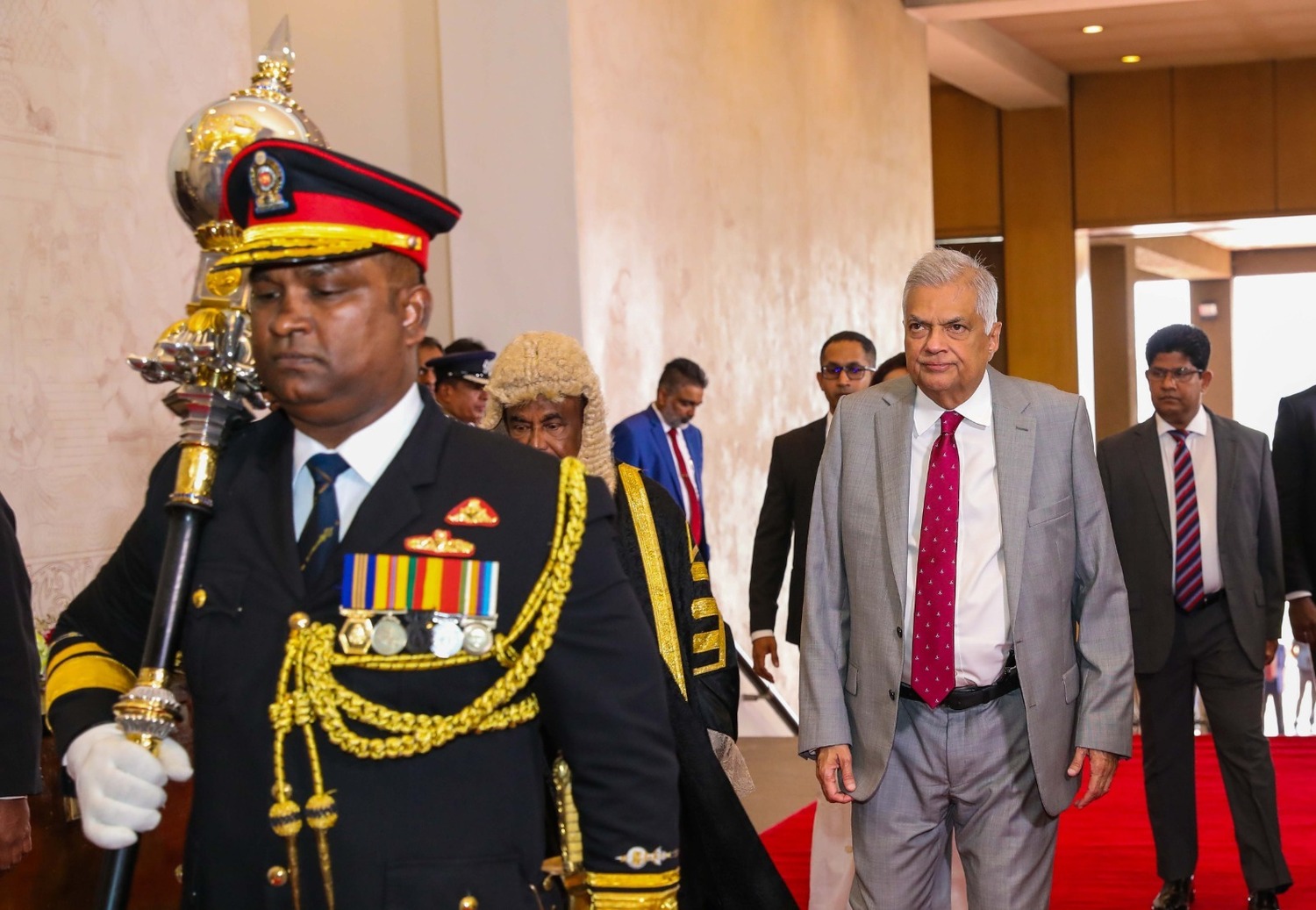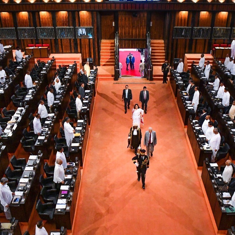 படைக்கள சேவிதர், பிரதி படைக்கள சேவிதர், சபாநாயகர், பாராளுமன்ற செயலாளர் நாயகம், பிரதி செயலாளர் நாயகம் உள்ளிட்டோர் புடைசூழ பாராளுமன்ற அவைக்குள் பிரவேசித்த ஜனாதிபதி ரணில் விக்ரமசிங்க, பாராளுமன்றத்தில் தனது கொள்கை விளக்க உரையை நிகழ்த்தினார்.