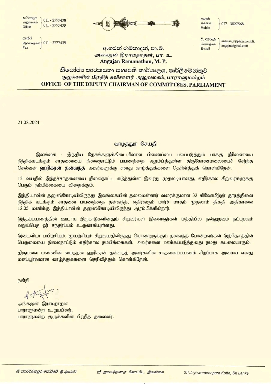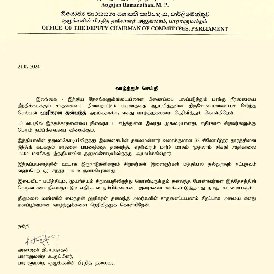 இலங்கை - இந்திய தேசங்களுக்கிடையிலான பிணைப்பை பலப்படுத்தும் பாக்கு நீரிணையை நீந்திக்கடக்கும் சாதனையை நிலைநாட்டும் பயணத்தை ஆரம்பித்துள்ள திருகோணமலையைச் சேர்ந்த செல்வன் ஹரிகரன் தன்வந்த் அவர்களுக்கு எனது வாழ்த்துக்களை தெரிவித்துக் கொள்கிறேன் என நாடாளுமன்ற உறுப்பினர் அங்கஜன் இராமநாதன் தெரிவித்துள்ளார்.