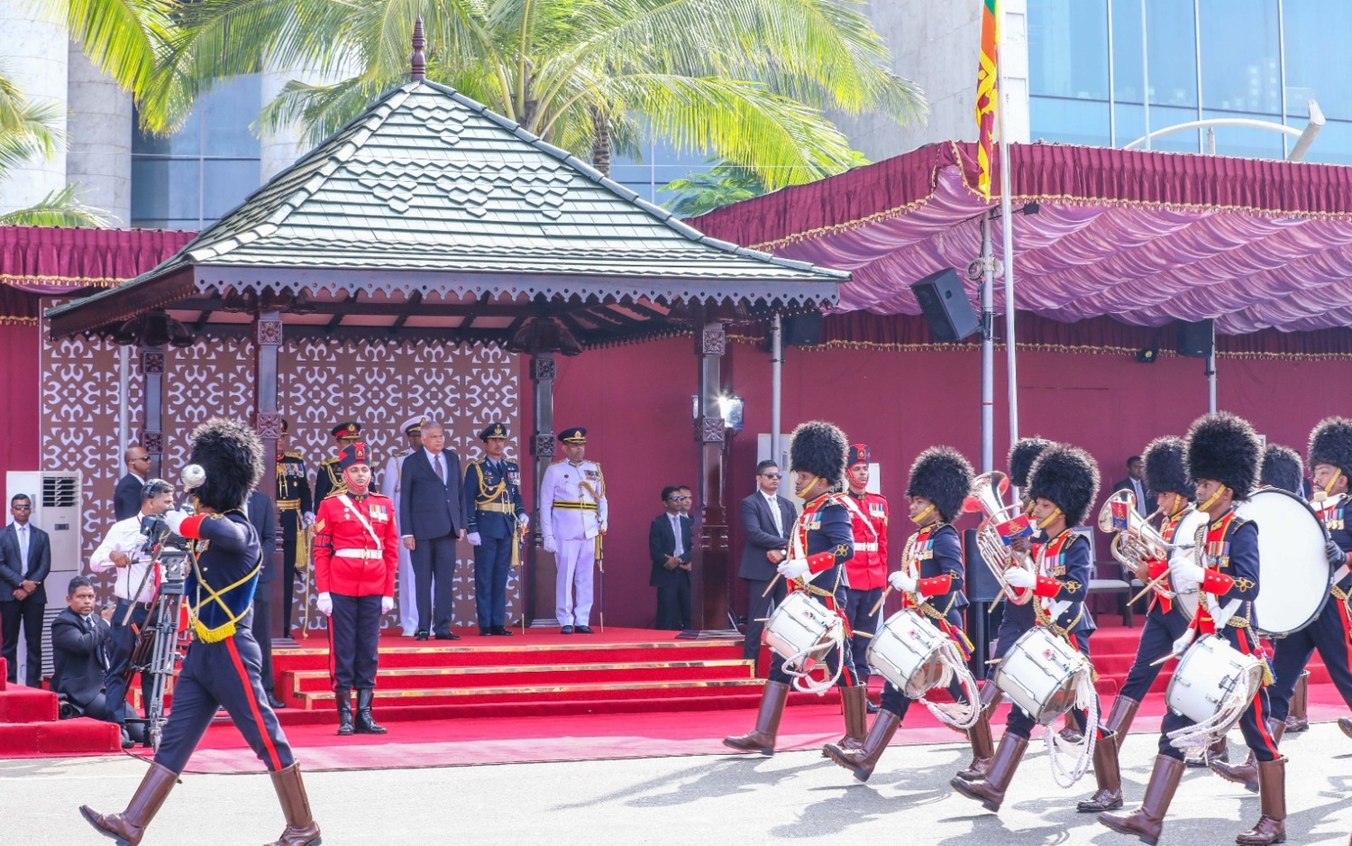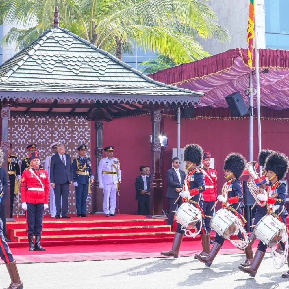 ஜனாதிபதியின் வருகையைக் குறிக்கும் வகையில் இலங்கை இராணுவத்தினர் இசைவாத்தியங்களை இசைத்த பின்னர், பாதுகாப்பு படைகளின் பிரதானி, முப்படைத் தளபதிகள் மற்றும் பதில் பொலிஸ் மா அதிபர் ஆகியோரால் ஜனாதிபதி, விழா நடைபெறும் மைதானத்தின் கொடிக் கம்பம் அருகே அழைத்து வரப்பட்டார்.
