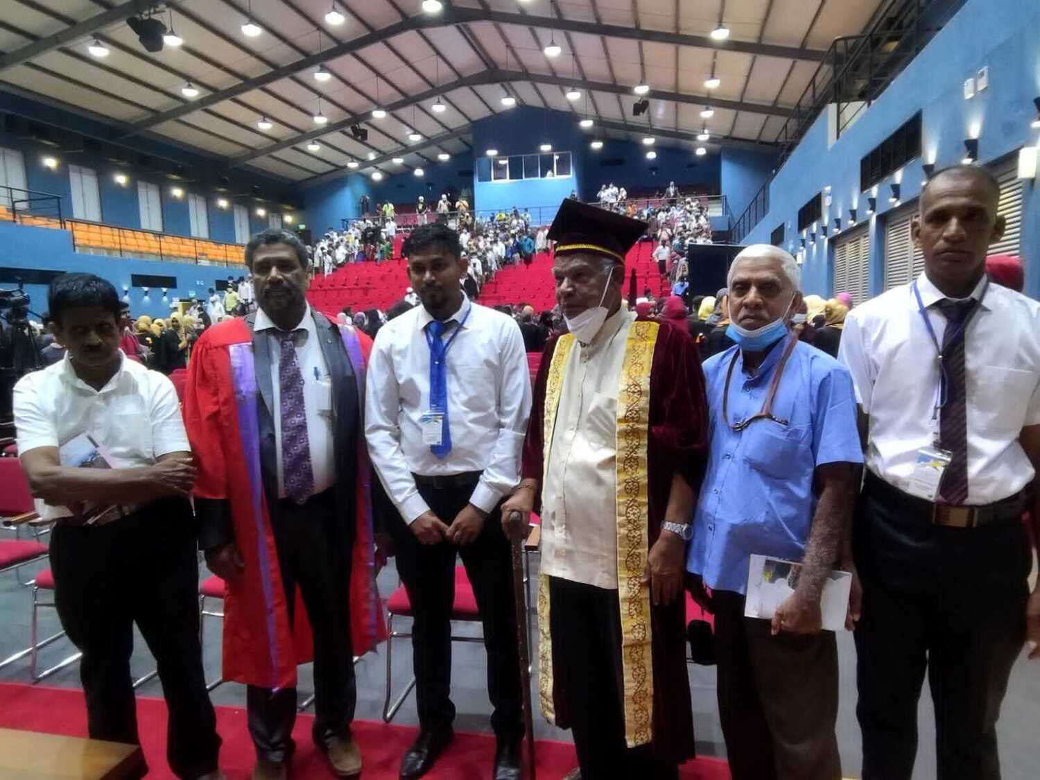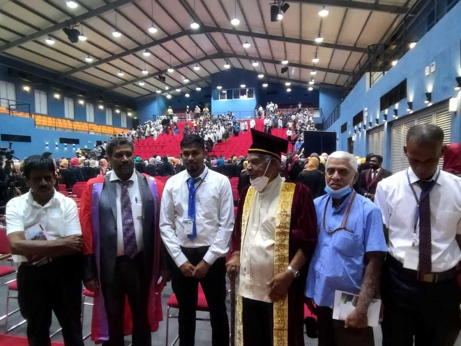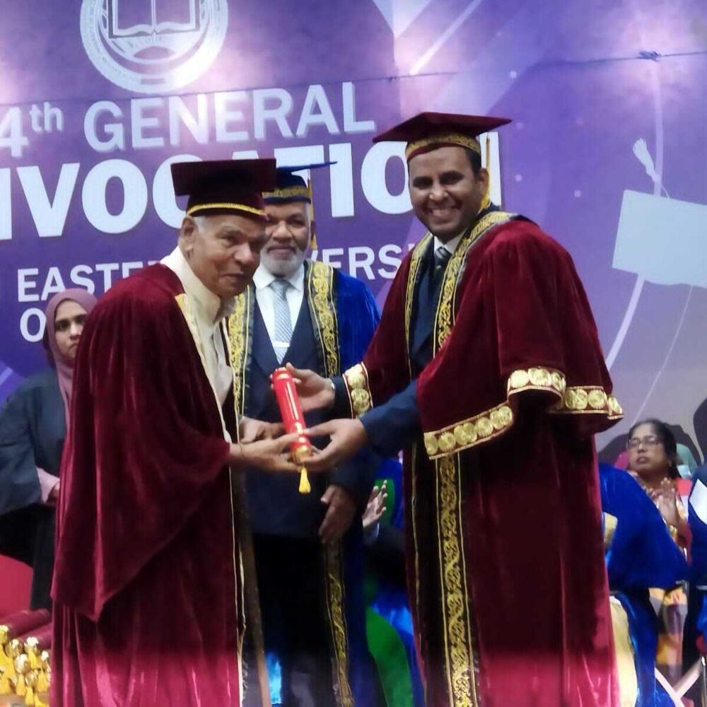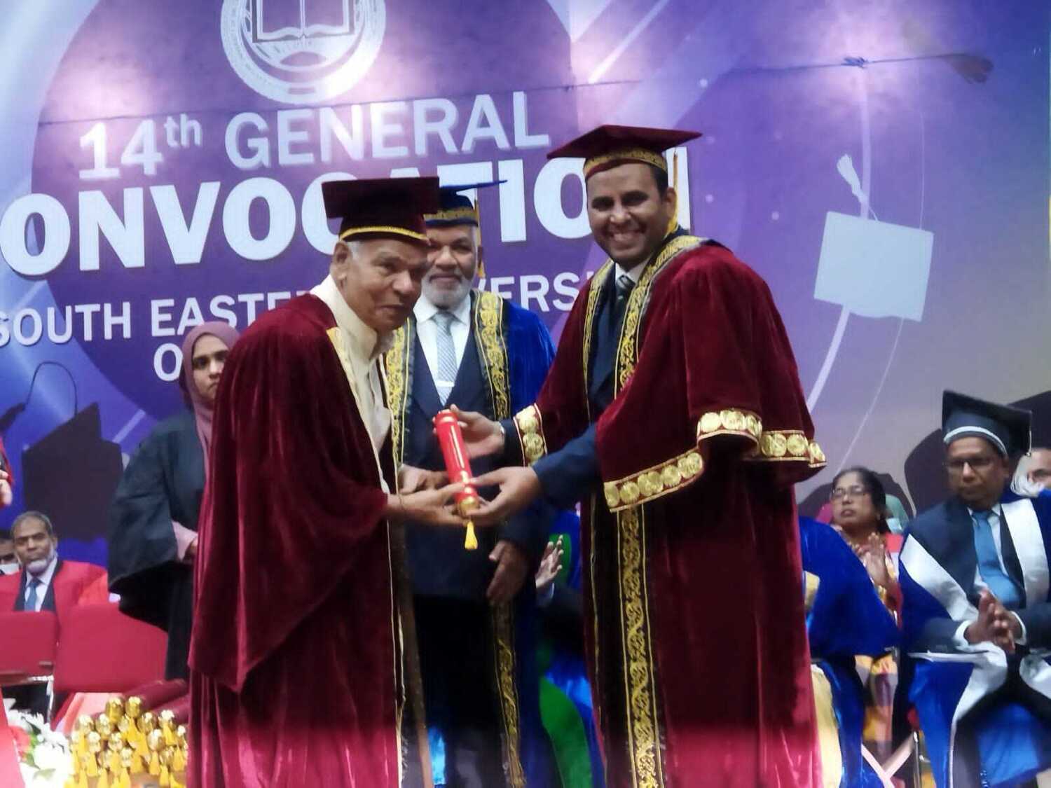 இதன்போது பல்கலைக்கழக பதிவாளர் எச். அப்துல் சத்தார், பேராசிரியர் ரமீஸ் அப்துல்லா ஆகியோர் சகிதம் கௌரவ கலாநிதி பட்டத்தை, மீயுயர் நீதிமன்ற (உயர்நீதிமன்ற) நீதியரசர் ஏ.எச்.எம். திலீப் நவாஸ், மற்றும் பல்கலைக்கழக பீடாதிபதிகள், விரிவுரையாளர்கள், துறைசார் தலைவர்கள், பட்டம் பெற்ற மாணவர்கள், பெற்றோர் முன்னிலையில் உபவேந்தர் ரமீஸ் அபூபக்கர் வழங்கி கௌரவித்தார்.