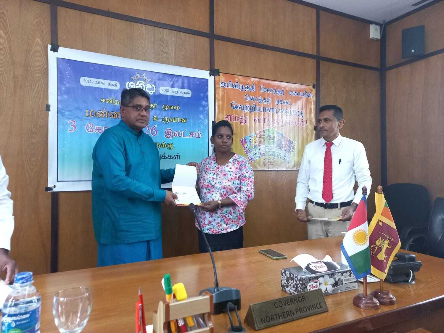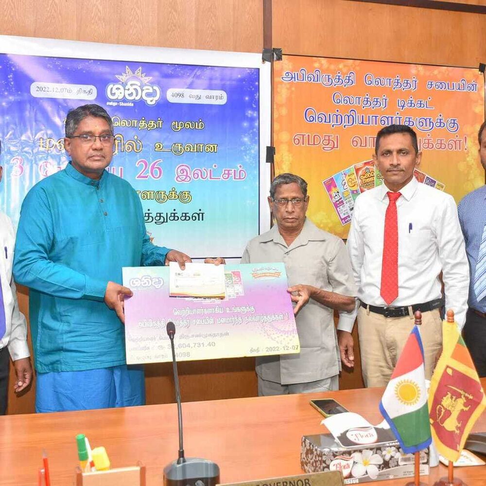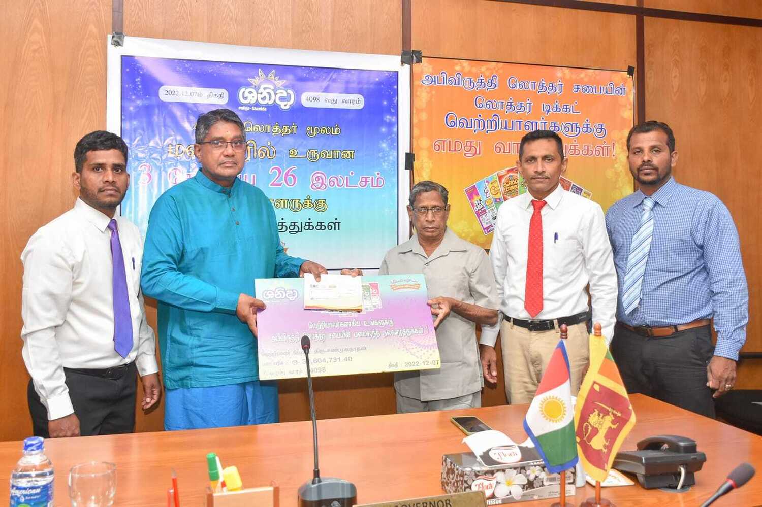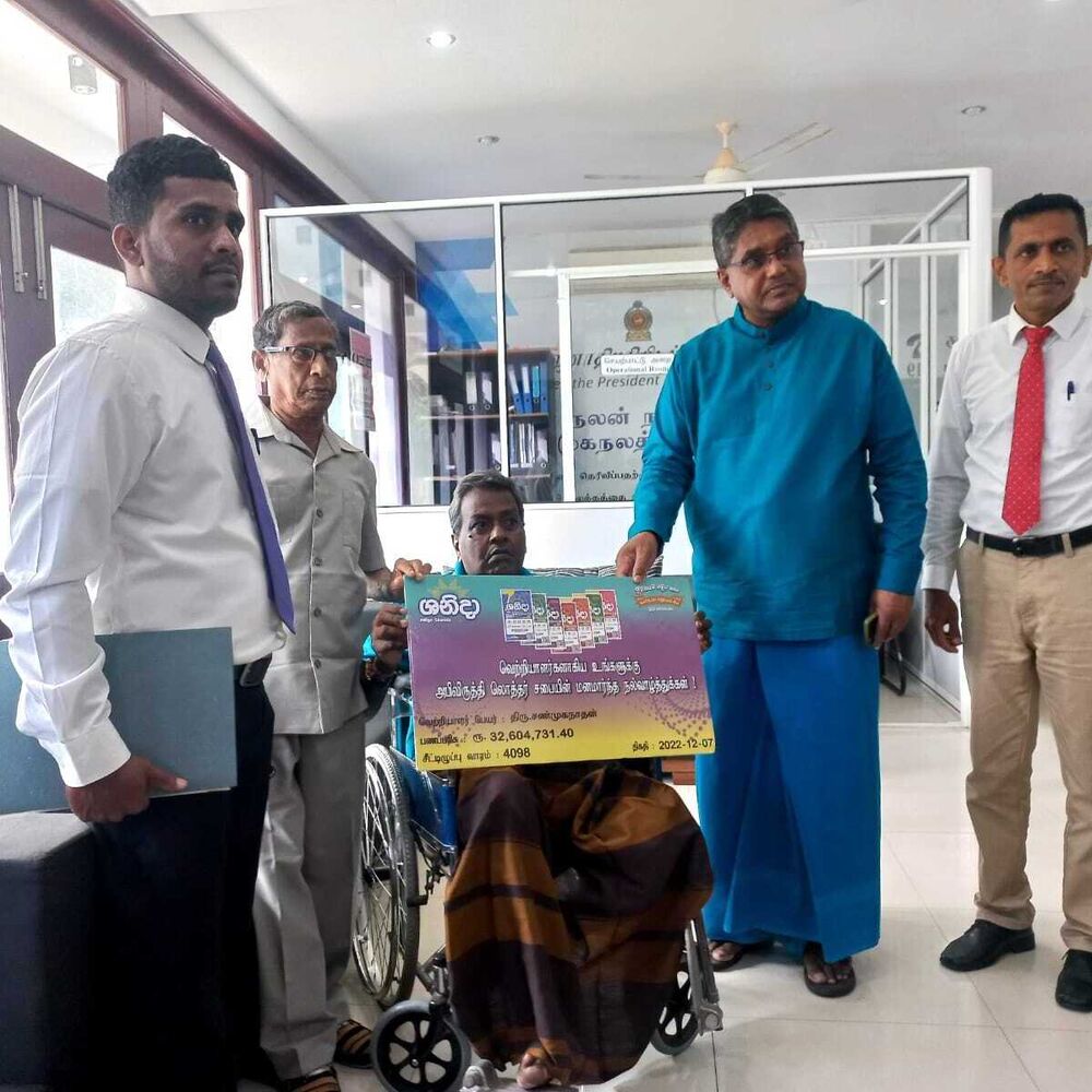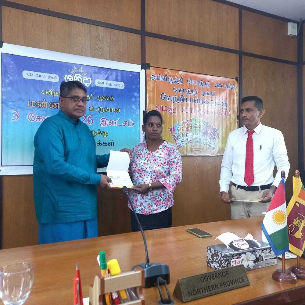 அபிவிருத்தி லொத்தர் சபையின் கடந்த இரண்டு மாதங்களில் வடமாகாணத்தில் வெற்றி பெற்ற வெற்றியாளர்களுக்கு வடமாகாண ஆளுனர் கௌரவ ஜீவன் தியாகராசா தலைமையில் வடகிழக்கு பிராந்திய முகாமையாளர் திரு. குமாரசிறி, யாழ்ப்பாணம் மற்றும் மன்னார் மாவட்ட விற்பனை மேம்படுத்தல் அதிகாரி திரு . தவகோகுலன், கிளிநொச்சி மற்றும் வவுனியா விற்பனை மேம்படுத்தல் அதிகாரி திரு. பிரதீபன் ஆகியோரின் முன்னிலையில் மன்னார் மாவட்டத்தில் சனிதா ரிக்கற்றின் மூலம் வெற்றி பெற்ற வெற்றியாளருக்கு மாபெரும் சுப்பர் பரிசான 3 கோடி 26 இலட்சம் ரூபா காசோலை மற்றும் பளைபிரதேசத்தில் வலம்புரி அதிஷ்ட ரிக்கற்மூலம் வெற்றி பெற்ற வெற்றியாளருக்கு 20 இலட்சம் காசோலை மற்றும் சங்கானை, யாழ்பாணம், சாவகச்சேரி, வவுனியா, மன்னார் பிரதேசங்களில் சனிதா அதோடிபதிஇகப்ருக்க அதிஷ்ட ரிக்கற் ஊடாக வெற்றி பெற்ற வெற்றியாளர்களுக்கு தலா 10 இலட்சம் காசோலைகளும் கௌரவ ஆளுநர் ஜீவன் தியாகராசா அவர்களால் வழங்கப்பட்டது இந்நிகழ்வு வடமாகாண ஆளுநர் அலுவலகத்தில் 07.01.2023 அன்று நடைபெற்றது.