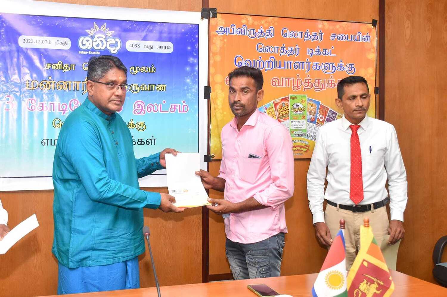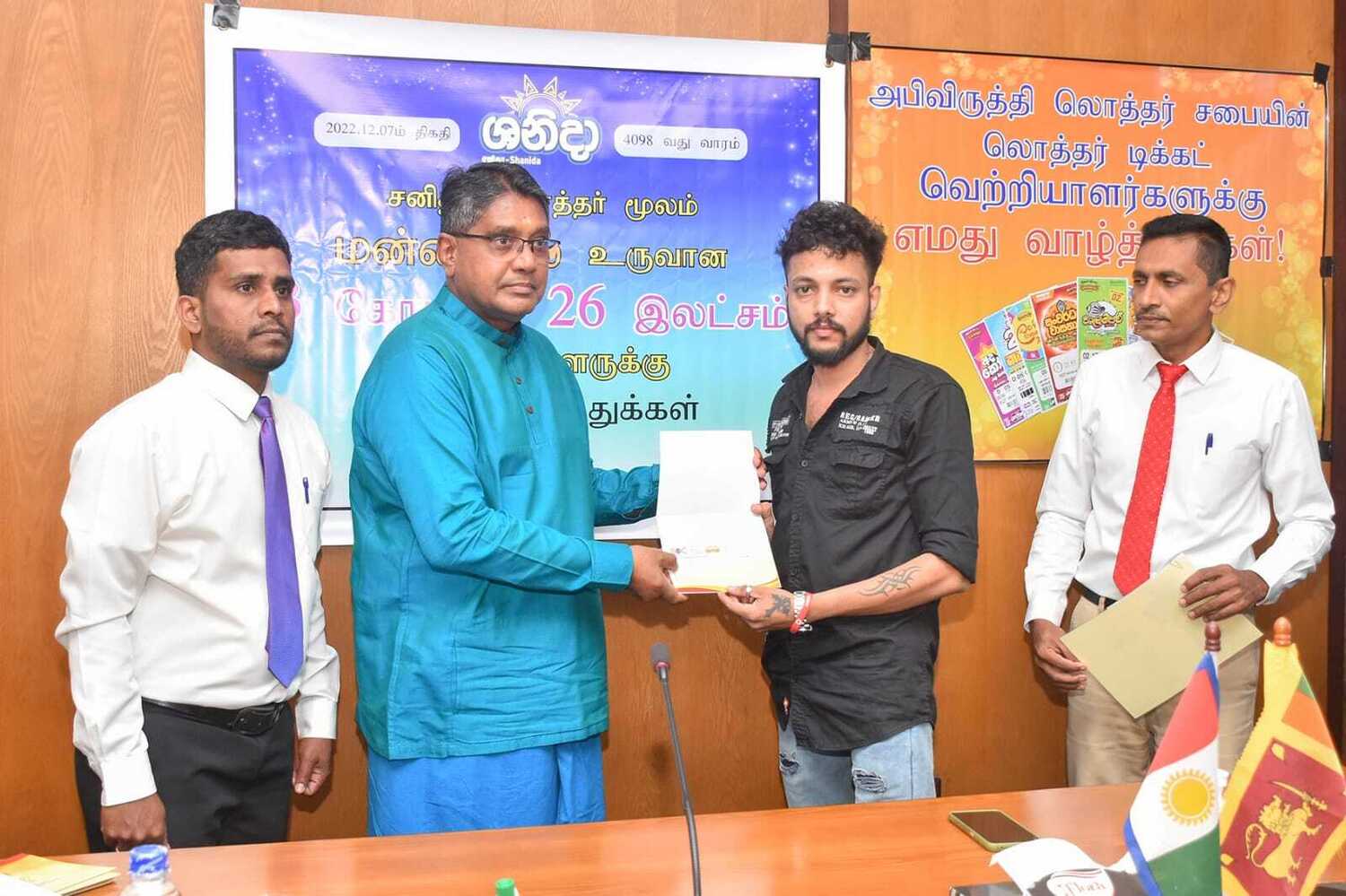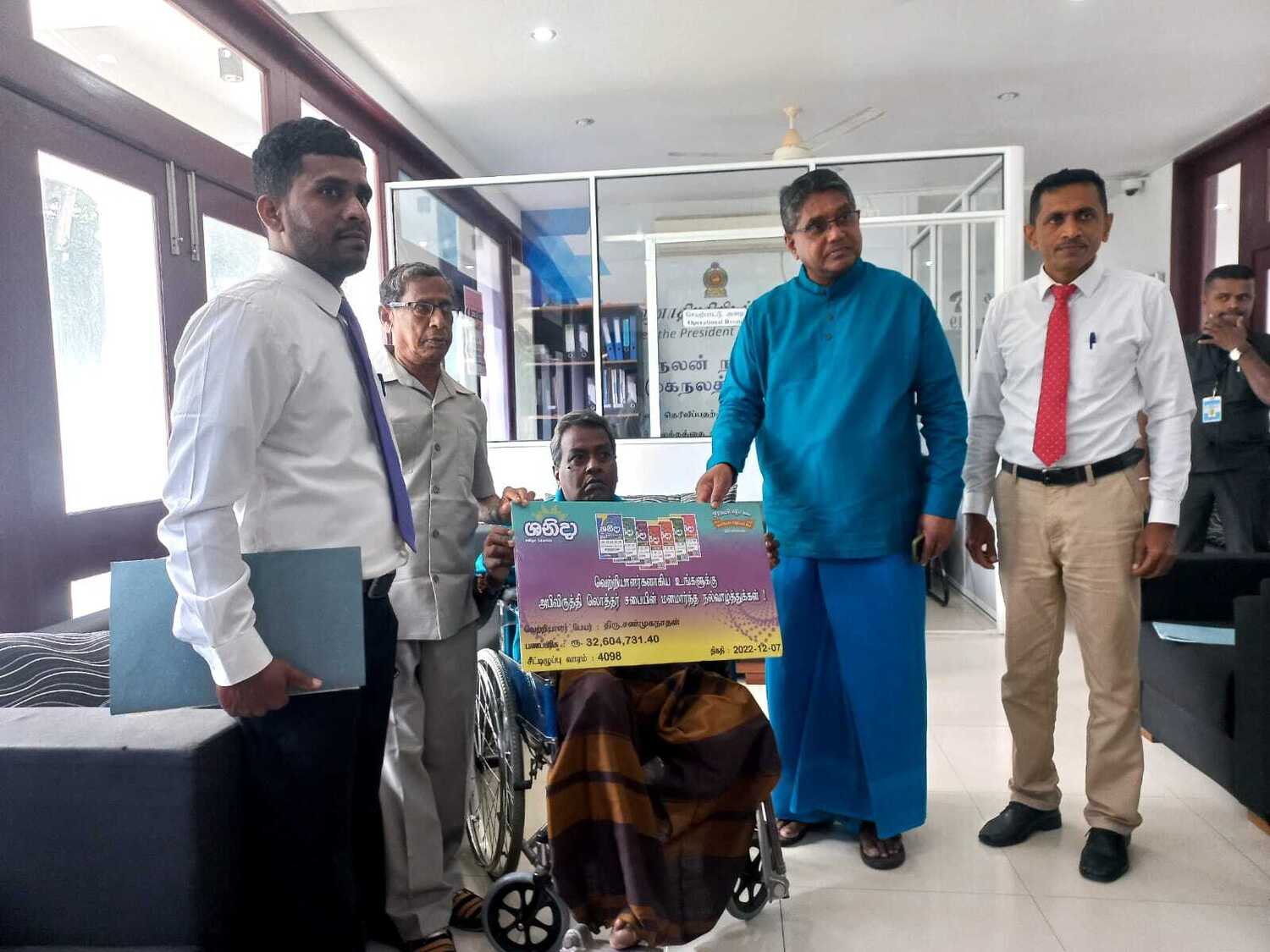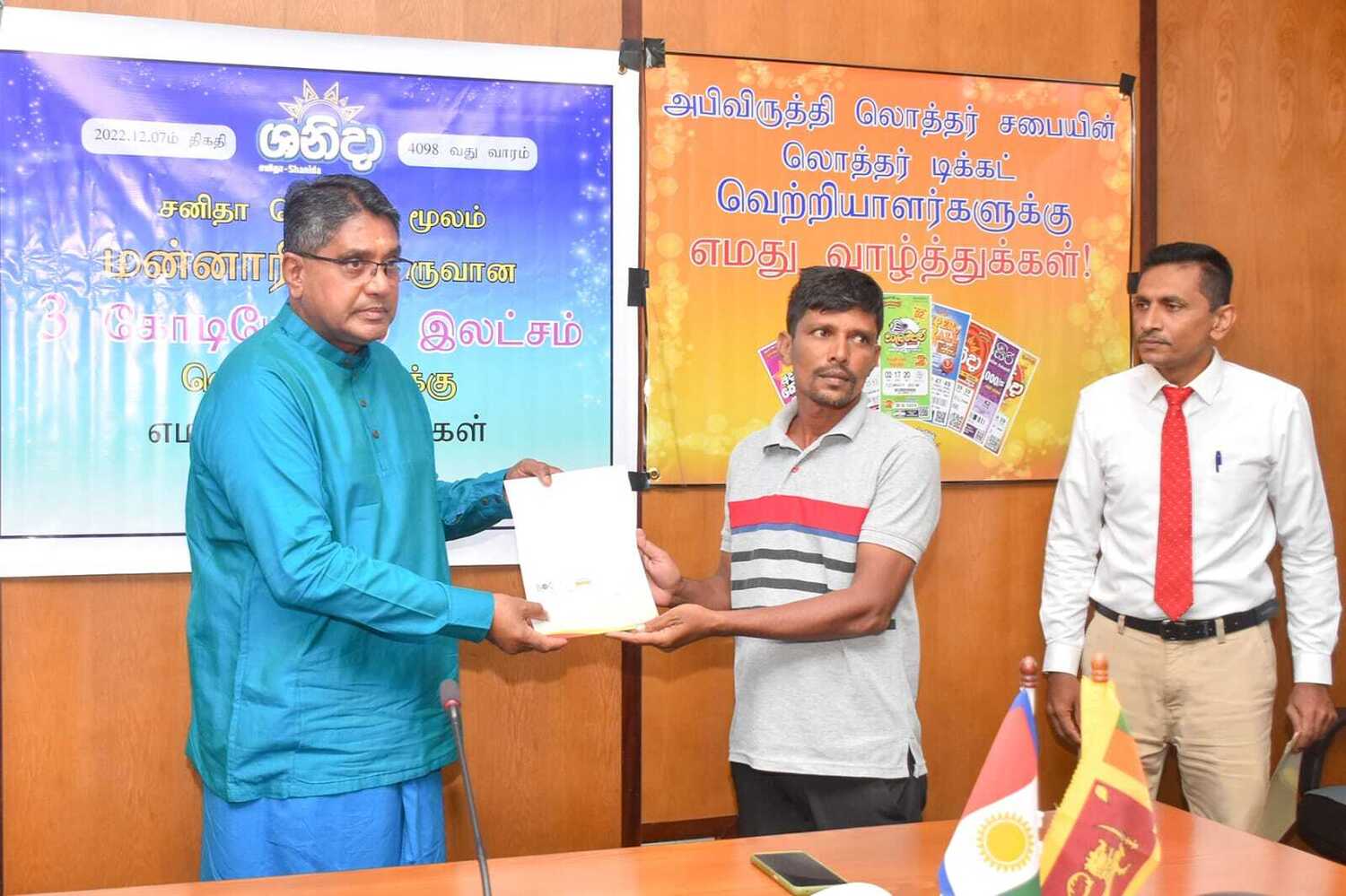 அபிவிருத்தி லொத்தர் சபையின் கடந்த இரண்டு மாதங்களில் வடமாகாணத்தில் வெற்றி பெற்ற வெற்றியாளர்களுக்கு வடமாகாண ஆளுனர் கௌரவ ஜீவன் தியாகராசா தலைமையில் வடகிழக்கு பிராந்திய முகாமையாளர் திரு. குமாரசிறி, யாழ்ப்பாணம் மற்றும் மன்னார் மாவட்ட விற்பனை மேம்படுத்தல் அதிகாரி திரு . தவகோகுலன், கிளிநொச்சி மற்றும் வவுனியா விற்பனை மேம்படுத்தல் அதிகாரி திரு. பிரதீபன் ஆகியோரின் முன்னிலையில் மன்னார் மாவட்டத்தில் சனிதா ரிக்கற்றின் மூலம் வெற்றி பெற்ற வெற்றியாளருக்கு மாபெரும் சுப்பர் பரிசான 3 கோடி 26 இலட்சம் ரூபா காசோலை மற்றும் பளைபிரதேசத்தில் வலம்புரி அதிஷ்ட ரிக்கற்மூலம் வெற்றி பெற்ற வெற்றியாளருக்கு 20 இலட்சம் காசோலை மற்றும் சங்கானை, யாழ்பாணம், சாவகச்சேரி, வவுனியா, மன்னார் பிரதேசங்களில் சனிதா அதோடிபதிஇகப்ருக்க அதிஷ்ட ரிக்கற் ஊடாக வெற்றி பெற்ற வெற்றியாளர்களுக்கு தலா 10 இலட்சம் காசோலைகளும் கௌரவ ஆளுநர் ஜீவன் தியாகராசா அவர்களால் வழங்கப்பட்டது இந்நிகழ்வு வடமாகாண ஆளுநர் அலுவலகத்தில் 07.01.2023 அன்று நடைபெற்றது.