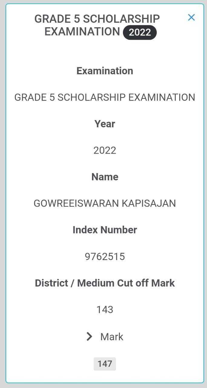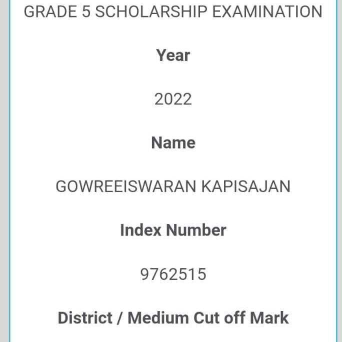 குறித்த பரீட்சையில் கௌரீஸ்வரன் கபிசயன் எனும் மாணவனே 147 புள்ளிகளைப் பெற்று சித்தியெய்தியுள்ளான். இவ்வெற்றி ஒரு ஆரம்பம். இனி வரும் காலங்களில் கபிசனின் வெற்றியை பின் தொடர்ந்து பலவித சாதனைகளை மாணவர்கள் எய்துவார்கள் என்பது பலரினதும் எதிர்பார்ப்பும் கூட.