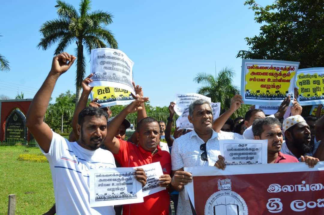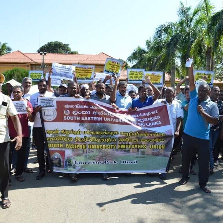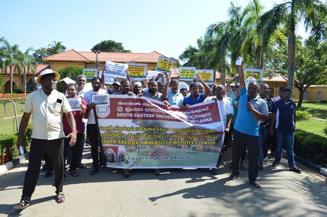 அனைத்துப் பல்கலைக்கழக தொழிற்சங்க சம்மேளனத்தின் வேண்டுகோளுக்கு அமைவாக நாட்டில் உள்ள அனைத்துப் பல்கலைக்கழகங்களிலும் முன்னெடுக்கப்படும் ஒரு நாள் அடையாள வேலை நிறுத்த தொழிற்சங்க நடவடிக்கைகளுக்கு அமைவாக, பல்கலைக்கழக சமூகம் எதிர்நோக்கும் பல்வேறு பிரச்சினைகளை முன்னிறுத்தி தென்கிழக்கு பல்கலைக்கழக ஊழியர்கள் சங்கம் முன்னெடுத்த ஒருநாள் பணி பகிஷ்கரிப்பு போராட்டம் இன்று (18) கல்விசாரா ஊழியர் சங்க தலைவர் எம்.ரீ.எம். தாஜுதீன் மற்றும் செயலாளர் எம்.எம். முஹம்மட் காமில் ஆகியோரது தலைமையில் பல்கலைக்கழக பிரதான நுழைவாயிலில் இடம்பெற்றது.