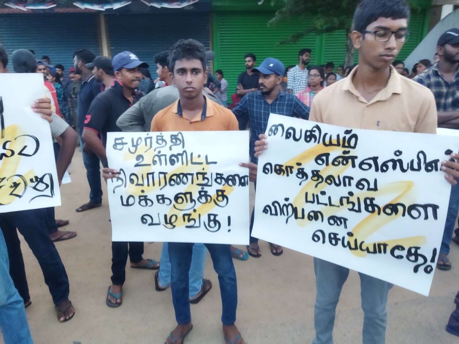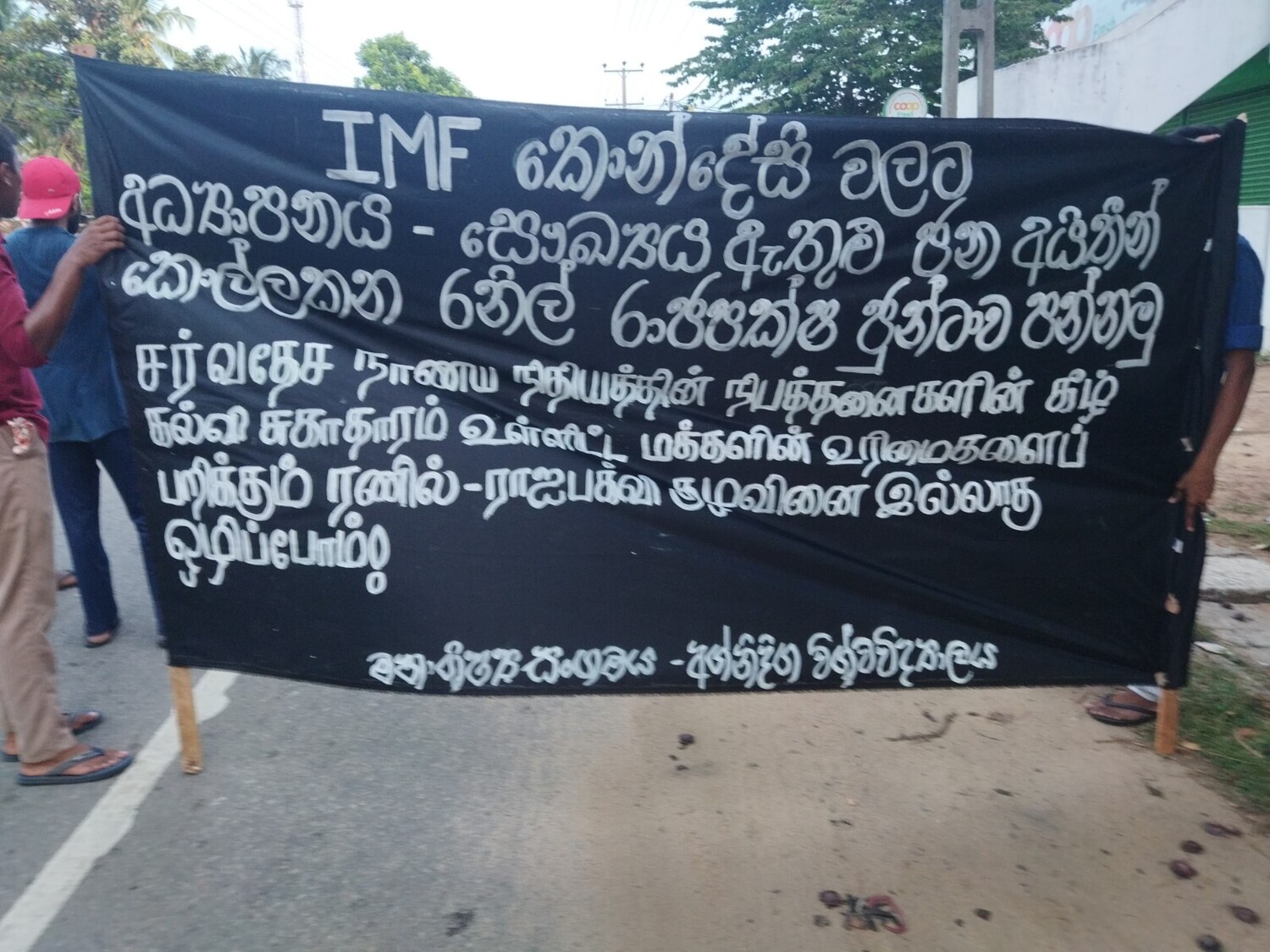 “நாட்டுக்காகப் போராடுவோம்” அராஜக ஆட்சியை ஒழிப்போம் - சமுர்த்தி உள்ளிட்ட நிவாரணங்களை மக்களுக்கு வழங்கு, வாழ்க்கைச் செலவுக்கு ஏற்ப மஹாபொல உதவித் தொகையை அதிகரிப்பதுடன், உரிய தவணையில் வழங்கு – லைகியம், என்.எஸ்.பி.எம்., கொத்தலாவலைப் பட்டங்களை விற்பனை செய்யாதே – என்பன போன்ற வாசகங்களடங்கிய சுலோக அட்டைகளை ஆர்ப்பாட்டப் பேரணியில் கலந்து கொண்டோர் ஏந்தியிருந்ததுடன் அவற்றைக் கோஷமாகவும் எழுப்பிய வண்ணமிருந்தனர்.