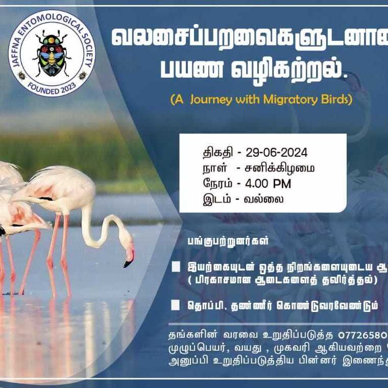 இயற்கை ஊக்குவிப்பு கழகம் (NAC), மற்றும் யாழ்ப்பாண பூச்சியல் சங்கத்தின் (JES) செயற்பாட்டில் வலசைப் பறவைகளில் பெரிய பூநாரைகளை பற்றிய பயணவழி கற்றல் 29.06.24 நடைபெற்றது.