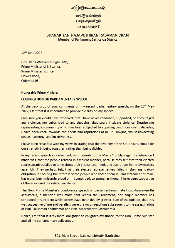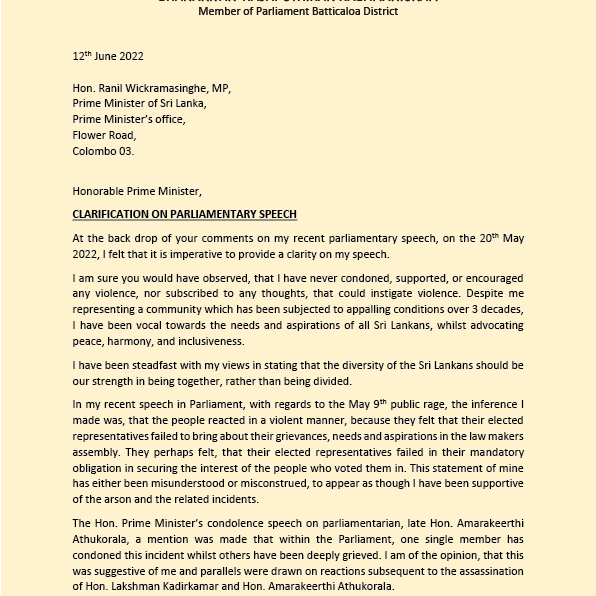 அனுப்பி வைத்துள்ள கடிதத்தில், ‘கடந்த மே மாதம் 20ஆம் திகதி, எனது சமீபத்திய நாடாளுமன்ற உரை குறித்த ஓர் தெளிவுபடுத்துதலின் கட்டாயம் எனக்குள்ளது.