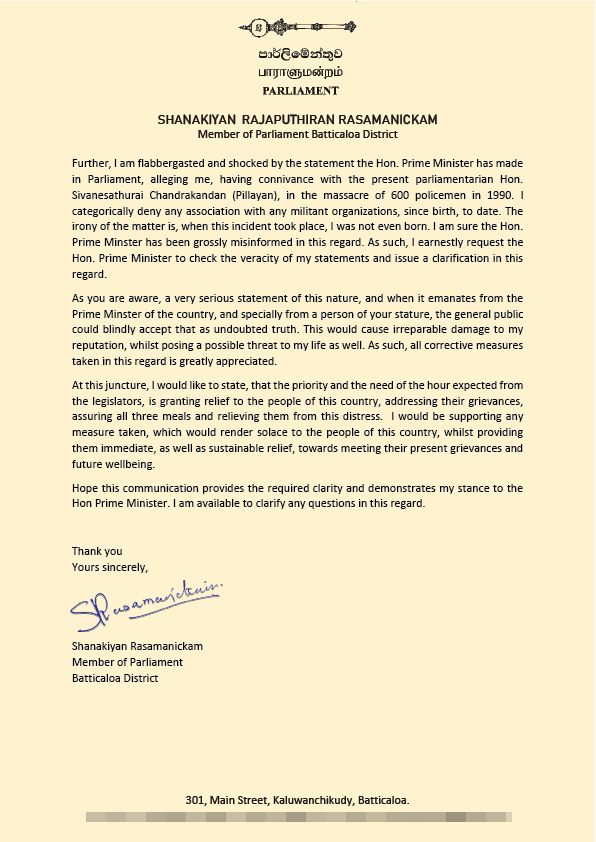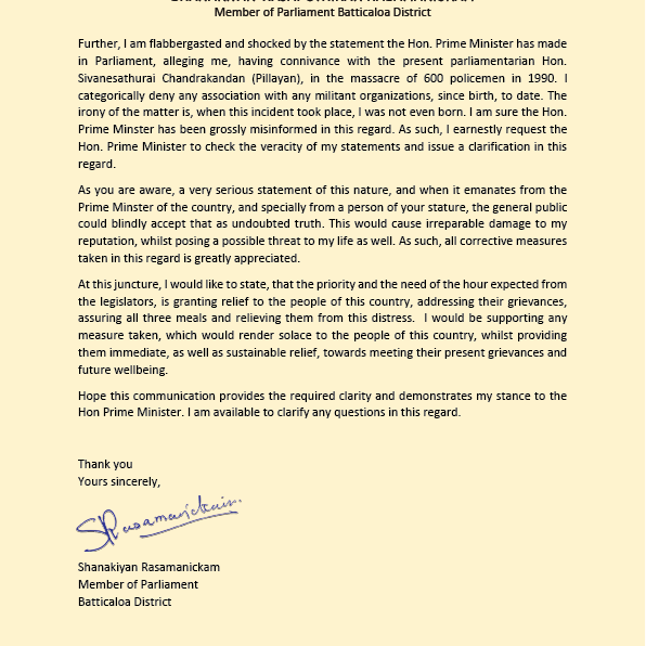 இந்த நிலையில் இது குறித்து தெளிவுபடுத்தும் வகையில் பிரதமர் ரணில் விக்கிரமசிங்கவிற்கு அனுப்பி வைத்துள்ள கடிதத்திலேயே தமிழ்த் தேசியக் கூட்டமைப்பின் நாடாளுமன்ற உறுப்பினர் இரா. சாணக்கியன் மேற்கண்டவாறு தெரிவித்துள்ளார்.