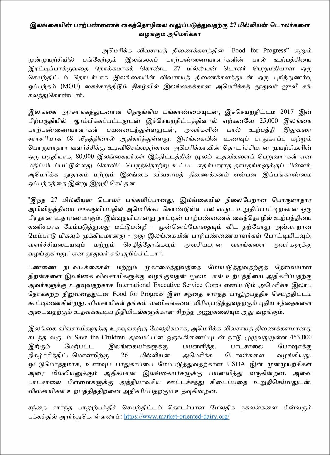 Ambassador Chung stated, “This $27 million contribution is a prime example of the United States’ multi-year commitment to promoting sustainable economic development in Sri Lanka. Not only is this support significantly improving production for the country’s dairy industry – more important now than ever – it is also equipping Sri Lankan dairy farmers with the resources necessary to compete, grow, and thrive.”