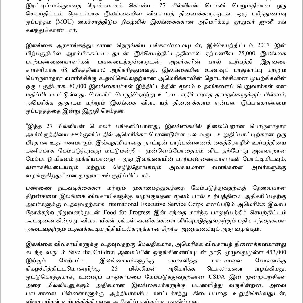 Today, U.S. Ambassador to Sri Lanka Julie Chung attended the signing ceremony for a Memorandum of Understanding (MOU) with the Sri Lankan Department of Agriculture, for a $27 million project that aims to double the milk production of Sri Lankan dairy farmers participating in the U.S. Department of Agriculture’s “Food for Progress” initiative.