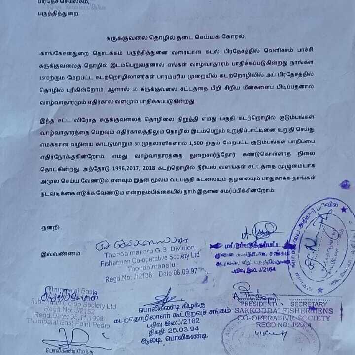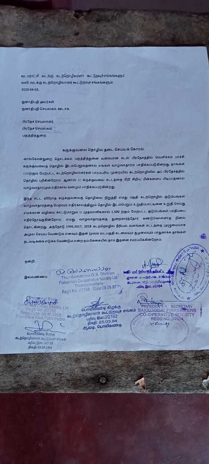 இந்த வகையிலே பருத்தித் துறை பிரதேசத்திலேயே வடமராட்சி வடக்கு கடற்றொழிலாளர்கள் எதிர்நோக்கி வருகின்ற பிரச்சினைகள் தொடர்பாக எங்களுடைய அதிமேதகு ஜனாதிபதி அவர்களுக்கு மூன்றாவது மகஜராக நாங்கள் பருத்தித் துறையை பிரதேச செயலகத்தை முற்றுகையிட்டு 2023 ஆம் ஆண்டு நாலாம் மாதம் பருத்தித்துறை பிரதேச செயலர் ஊடாகவும் மகஜர் அனுப்பியிருந்தோம். அதற்கும் இதுவரை எந்தவிதமான பதிலும் கிடைக்கவில்லை.