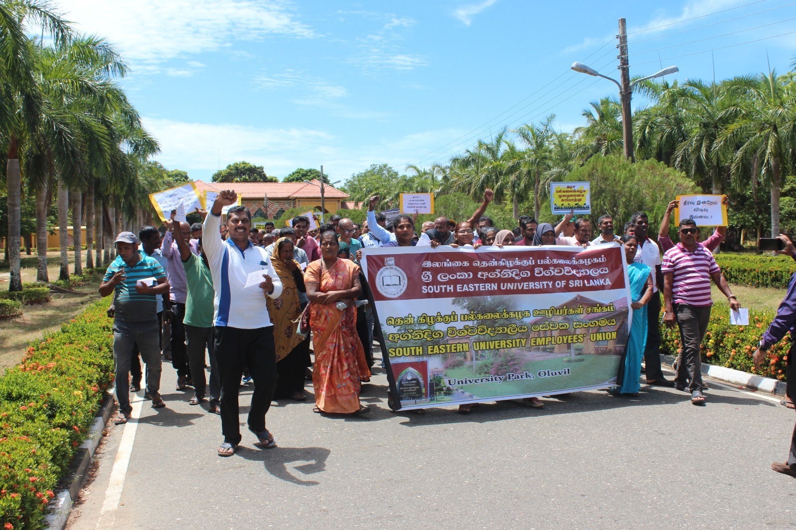 தென்கிழக்கு பல்கலைக்கழகத்தில் நேற்று (27) ஒருபக்கம் ஊழியர்களின் சத்யாக்கிரகப் போராட்டமும் நடந்ததுடன், மறுபுறம் நியாயம் கோரி பேரணியும் நடைபெற்று பல்கலைக்கழக முற்றலை அதிர வைத்தன.