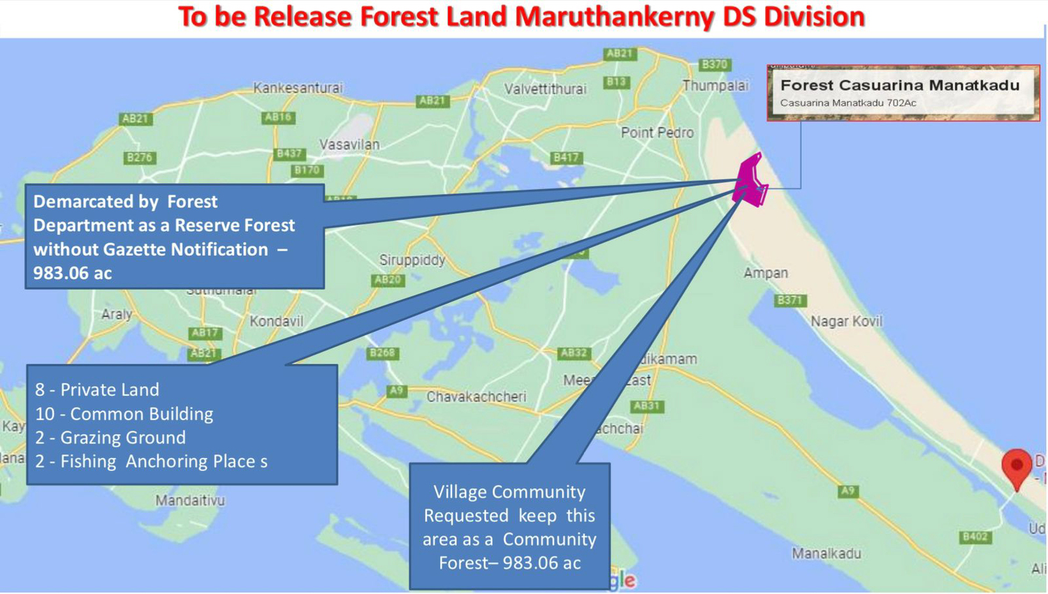 மக்களினால் அமைக்கப்பட்ட மணற்காடு சவுக்கு மரக் காட்டினை மக்கள் மயப்படுத்த வேண்டும் என்கிற மக்களின் கோரிக்கையை யாழ். மாவட்ட பாராளுமன்ற உறுப்பினரும், பாராளுமன்ற குழுக்களின் பிரதித் தவிசாளரும், யாழ். மாவட்ட ஒருங்கிணைப்புக் குழுவின் தலைவருமான கௌரவ அங்கஜன் இராமநாதன் அவர்கள், அமைச்சரின் கவனத்துக்கு கொண்டு சென்றதையடுத்து இத்தீர்மானம் எடுக்கப்பட்டுள்ளது.