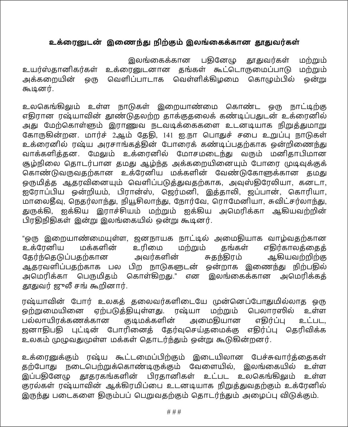 While talks between Ukraine and the Russian Federation are now in progress, voices around the world – including these seventeen Chiefs of Mission here in Sri Lanka – will continue to call for Russia’s immediate halt of its invasion and withdrawal of forces from Ukraine.