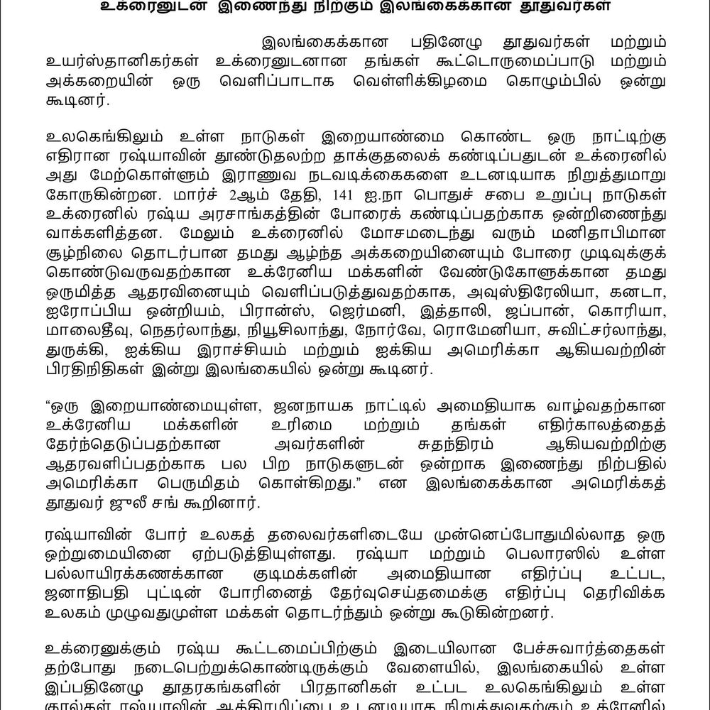 Nations around the world are denouncing Russia’s unprovoked aggression against a sovereign country and demanding immediate end to the military operations in Ukraine. On March 2, 141 U.N. General Assembly Member States voted together to condemn the Russian government’s war in Ukraine. And in Sri Lanka today, representatives of Australia, Canada, European Union, France, Germany, Italy, Japan, Korea, Maldives, Netherlands, New Zealand, Norway, Romania, Switzerland, Turkey, United Kingdom, and United States gathered to express their grave concern at the deteriorating humanitarian situation and united support for the Ukrainian people’s plea to end the war.