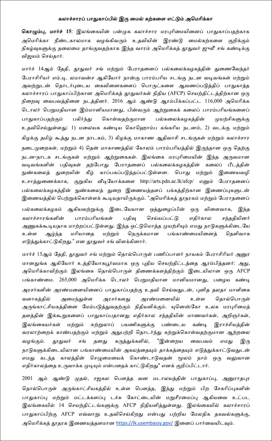 On March 14, Ambassador Chung and University of Peradeniya Vice Chancellor Professor M.D. Lamawansa held a closing ceremony for a U.S. Ambassadors Fund for Cultural Preservation (AFCP) project that documented and preserved four traditional ritual dance forms and related crafts. The $116,000 grant, initiated in 2016, supported the university’s effort to preserve and to share the following performing arts traditions: 1) upcountry Kandyan Kohomba Kankariya dance, 2) Northern and Eastern Tamil Koothu dance drama, 3) Adivasi rituals and cultural practices from Eastern Province, and 4) a southern dance-drama rituals and performance from the Kolam tradition in Southern Province. Recordings of these intangible forms of Sri Lanka’s heritage are now archived under the Department of Fine Arts, Faculty of Arts, University of Peradeniya. For public and online reference, shorter videos will be available on the internet with links in the Department of Fine Arts website of the University of Peradeniya at http://arts.pdn.ac.lk/afcp/. Ambassador Chung explained, “As a result of the collaboration between the U.S. Embassy and University of Peradeniya, the traditions of these cultures have been recorded and made accessible to future generations. This entire effort demonstrates the deep respect and close partnership between our countries.”
