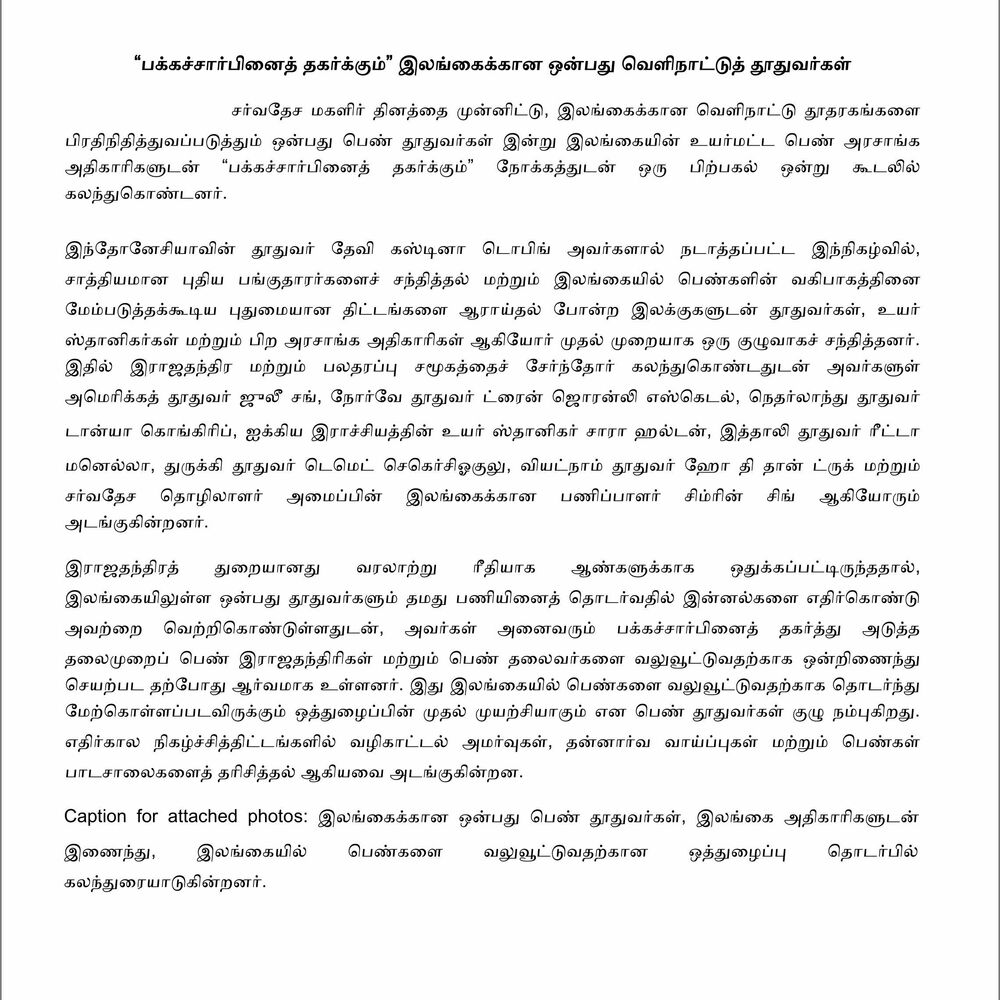 Caption for attached photos: Nine female Chiefs of Mission to Sri Lanka, together with Sri Lankan officials, discuss collaboration to support of women’s empowerment in Sri Lanka.