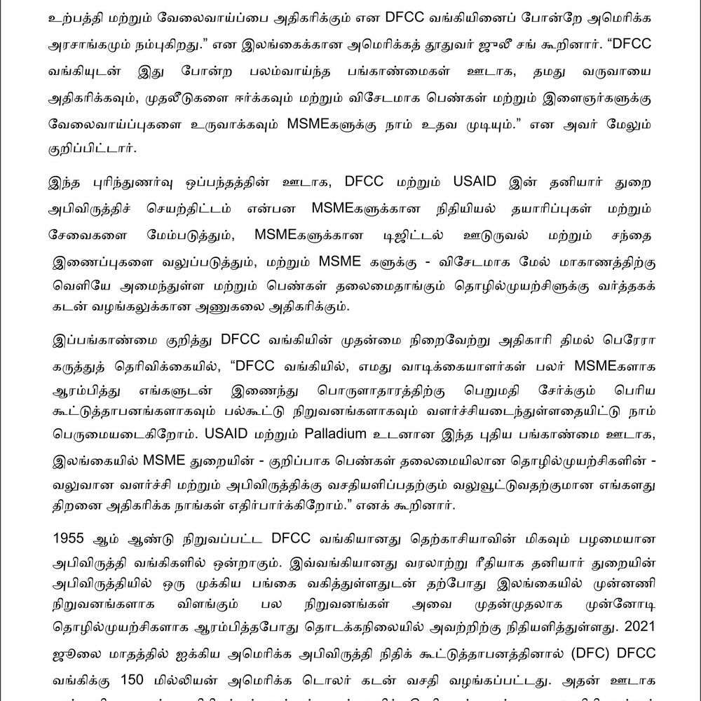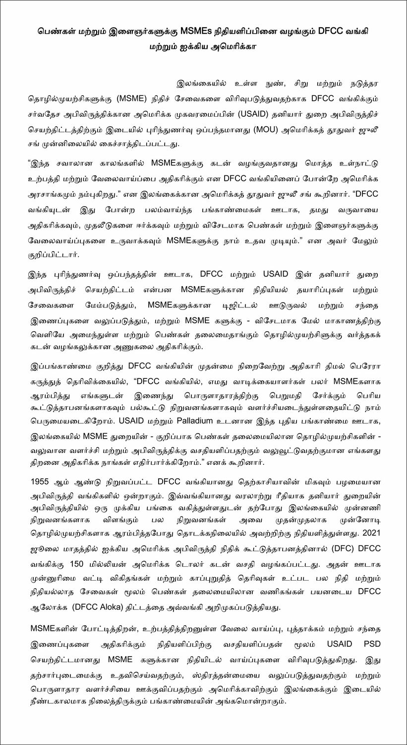 “The U.S. Government shares DFCC’s belief that lending to MSMEs will increase GDP and employment during these challenging times,” said U.S. Ambassador to Sri Lanka Julie Chung. “Through powerful partnerships such as this one with DFCC Bank, we can help MSMEs increase revenues, attract investments, and create jobs – especially for women and youth.”
