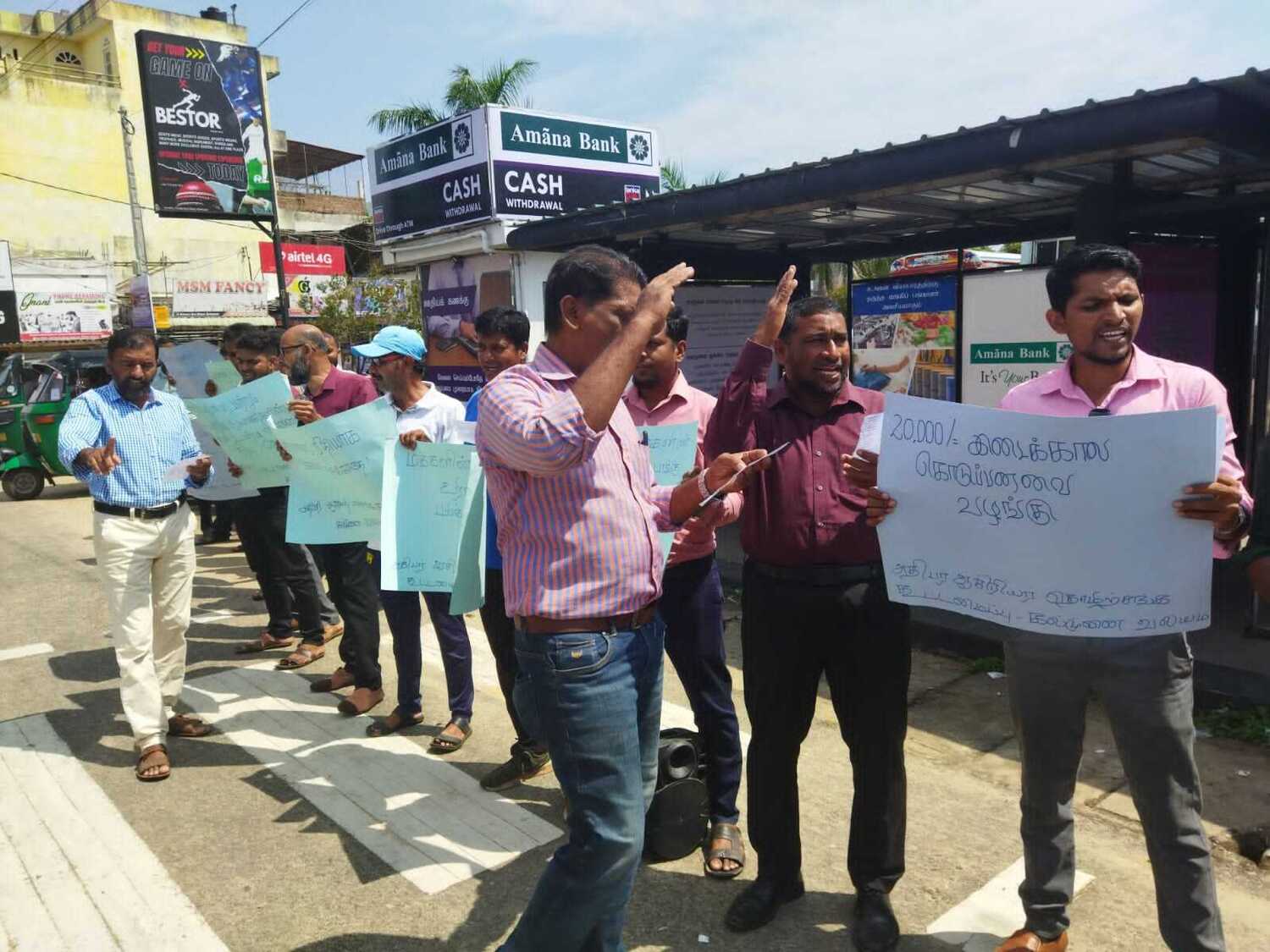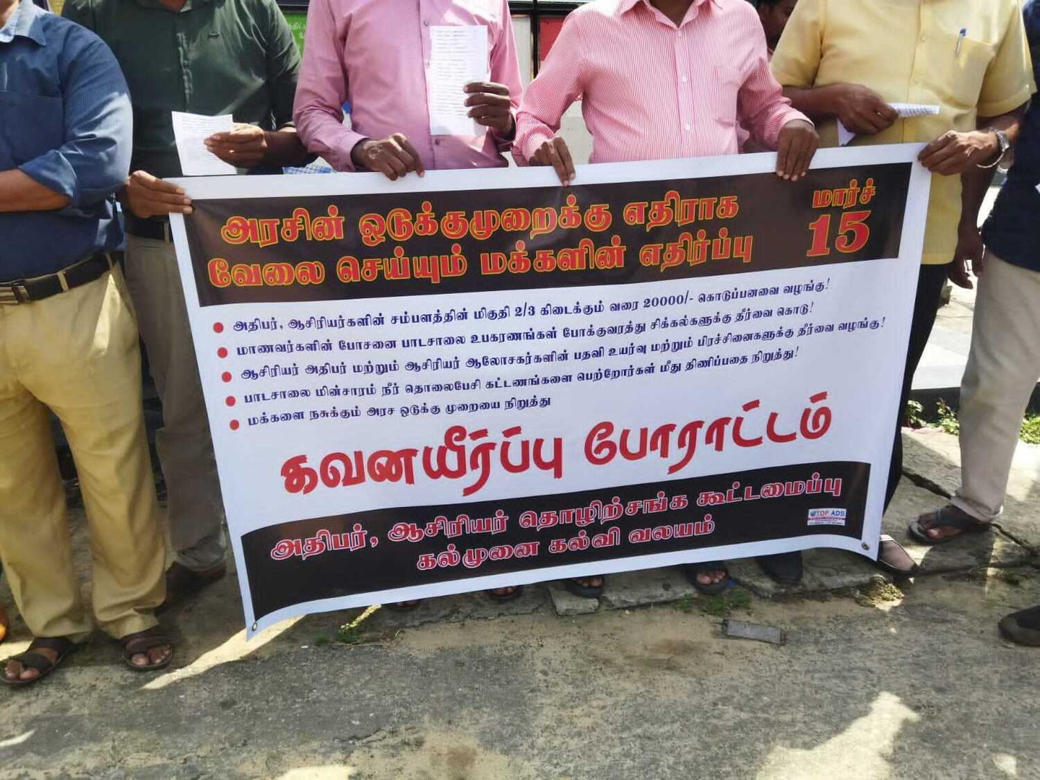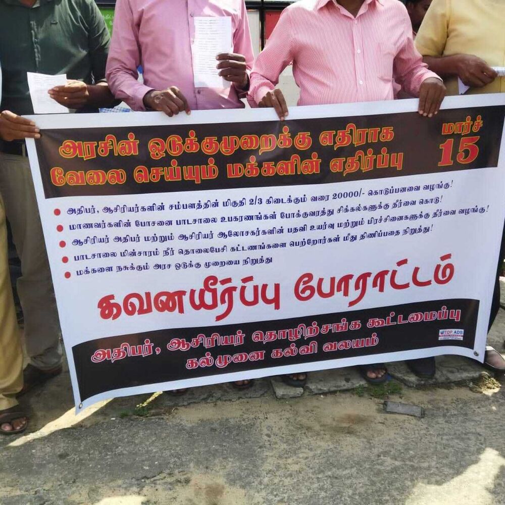 சுமார் ஒரு மணி நேரம் இடம்பெற்ற இந்த ஆர்ப்பாட்டத்தில் கலந்து கொண்ட அதிபர்கள், ஆசிரியர்கள் அரசுக்கு எதிராகப் பல கோஷங்களை எழுப்பியதுடன், ஆசிரியர்கள், மாணவர்கள் எதிர் நோக்கும் அவலங்களை வெளிப்படுத்தும் சுலோக அட்டைகளையும் ஏந்தியிருந்தனர்.