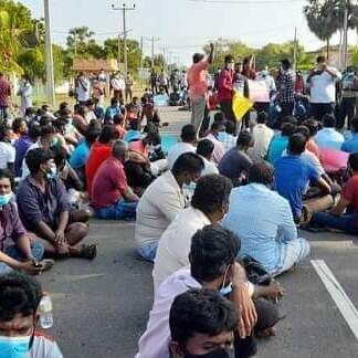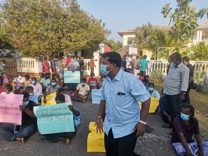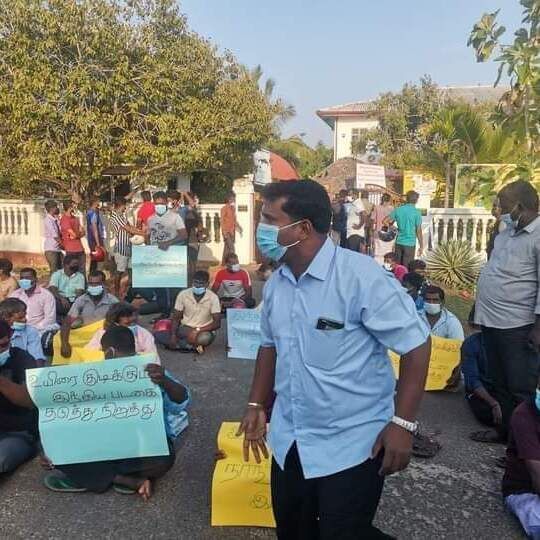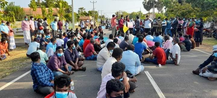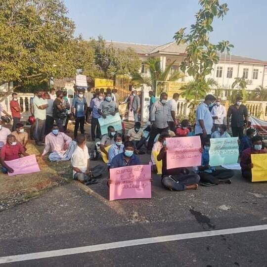 போன்ற கோசங்களை எழுப்பிக் கொண்டு பிரதேச செயலக அதிகாரிகஉள்ளே செல்லாதவண்ணம் வழிமறித்து கோஷம் எழுப்பியவண்ணம் இருந்தனர்.