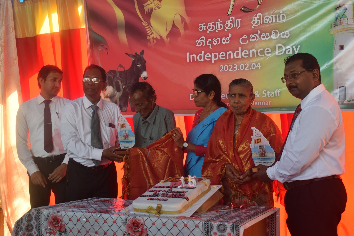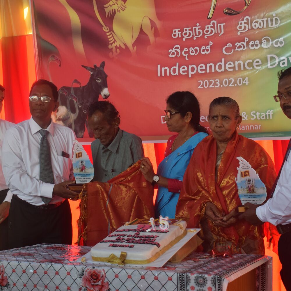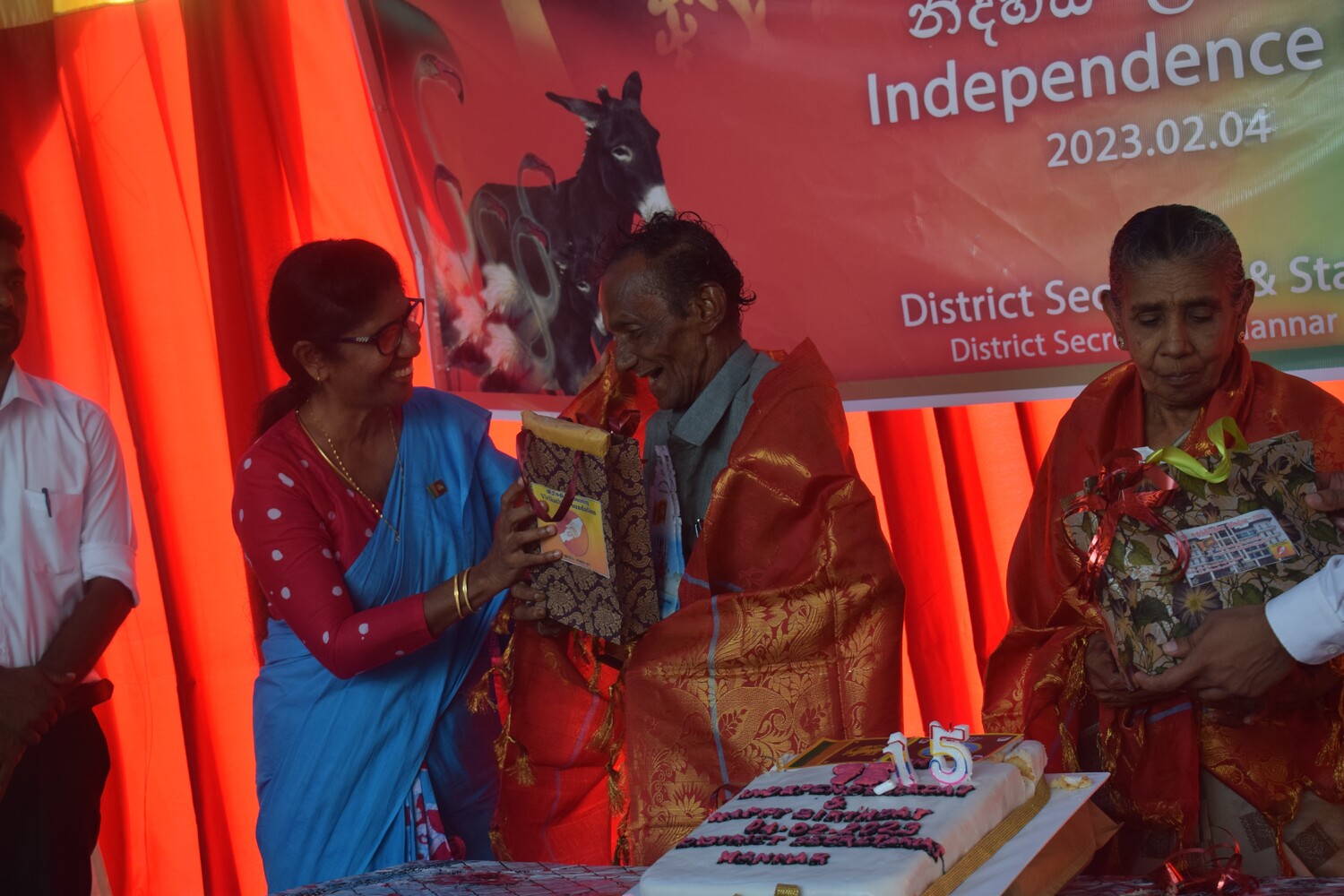 மன்னார் மாவட்ட செயலகத்தில் சனிக்கிழமை (04) நடைபெற்ற சுதந்திர தினத்தன்று இவ் சிரேஷ்ட பிரஜைகளான திரு அந்தோனிப்பிள்ளை மற்றும் திருமதி அந்தோனி செபமாலை ஆகியோருக்கு அரசாங்க அதிபர் திருமதி அ.ஸ்ரான்லி டிமெல் தலைமையில் நான்கு மதத் தலைவர்கள் ஆசீருடன் சுதந்தின தின மேடையில் வைத்து கேக் வெட்டி அவர்களுக்கு பொன்னாடை போர்த்தி பரிசில்கள் வழங்கி கௌரவம் வழங்கப்பட்டது.