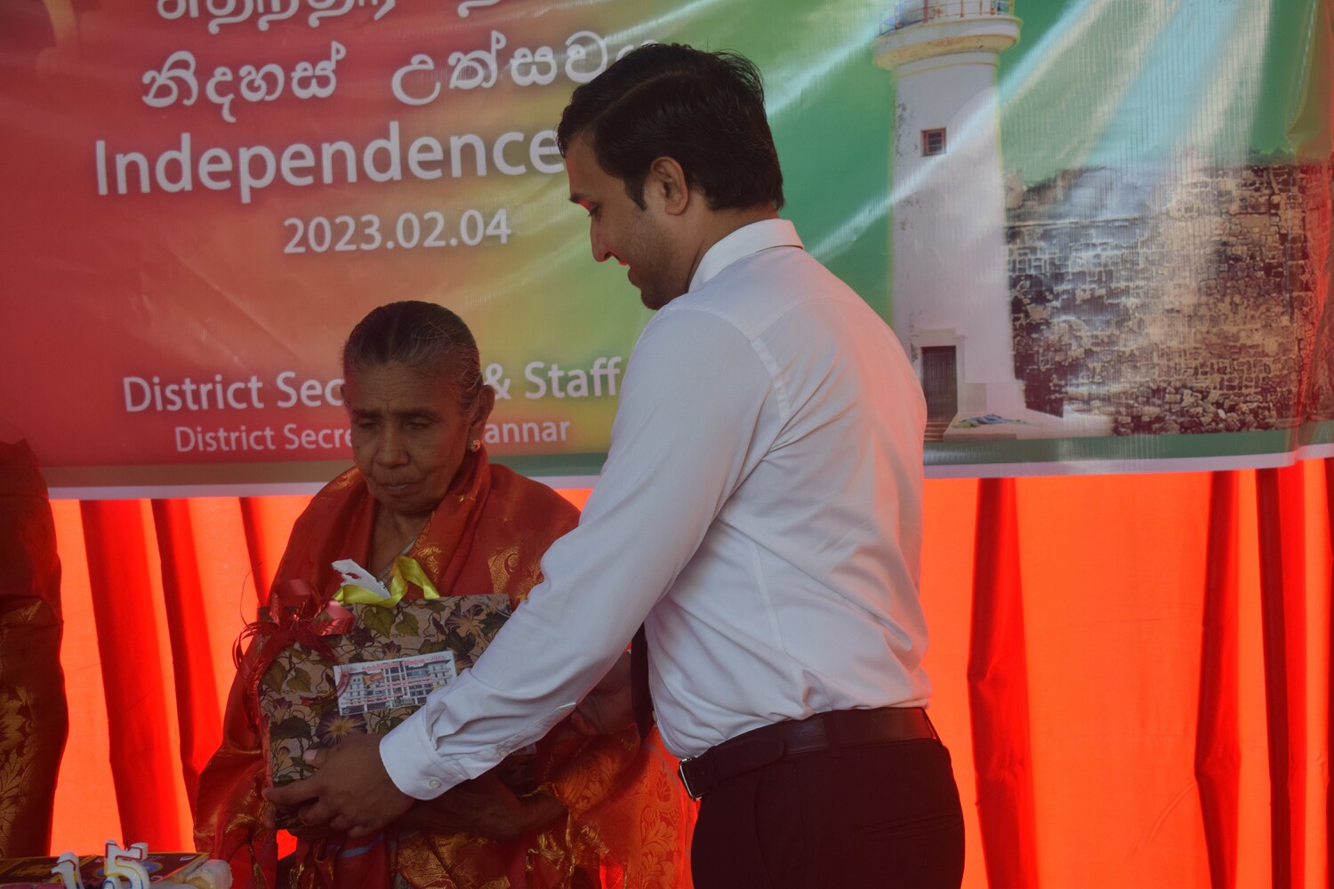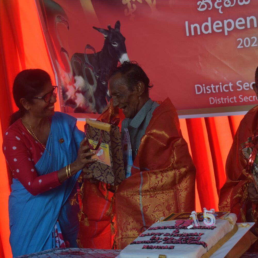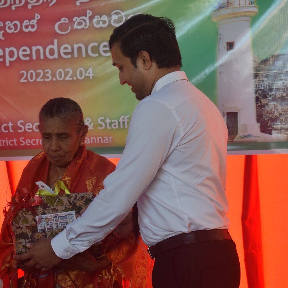 மன்னார் மாவட்ட செயலகத்தில் சனிக்கிழமை (04) நடைபெற்ற சுதந்திர தினத்தன்று இவ் சிரேஷ்ட பிரஜைகளான திரு அந்தோனிப்பிள்ளை மற்றும் திருமதி அந்தோனி செபமாலை ஆகியோருக்கு அரசாங்க அதிபர் திருமதி அ.ஸ்ரான்லி டிமெல் தலைமையில் நான்கு மதத் தலைவர்கள் ஆசீருடன் சுதந்தின தின மேடையில் வைத்து கேக் வெட்டி அவர்களுக்கு பொன்னாடை போர்த்தி பரிசில்கள் வழங்கி கௌரவம் வழங்கப்பட்டது.