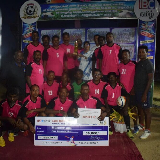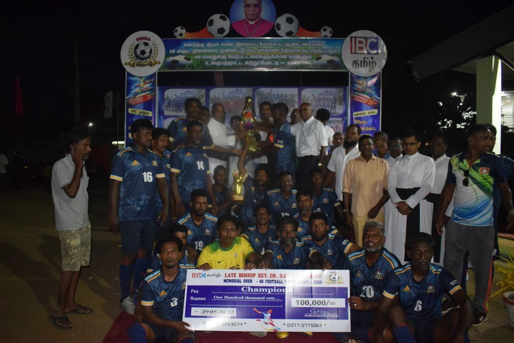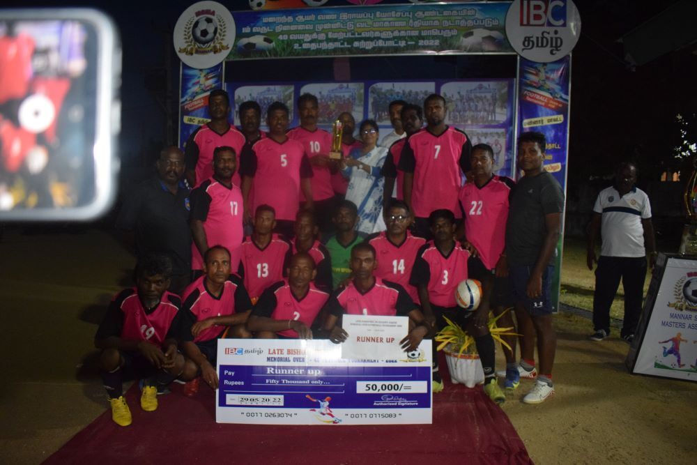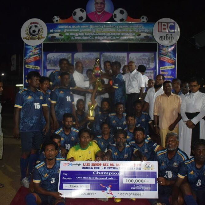 மறைந்த மன்னார் மறை மாவட்ட மேதகு இராயப்பு யோசேப்பு ஆண்டகையின் முதலாம் ஆண்டு நினைவேந்தலை முன்னிட்டு மன்னார் மாவட்ட சிரேஷ்ட உதைபந்தாட்ட சம்மேளனம் (சொர்க்கோ மாஸ்ரர்) ஐபிசி தமிழ் ஊடக அனுசரனையும் நடாத்திய உதைபந்தாட்ட சுற்றுப் போட்டியில் மன்னார் விளையாட்டு கழகம் 2-0 என்ற கோல்களால் யாழ்ப்பாணம் விளையாட்டு கழகத்தை வெற்றியீட்டியுள்ளது.